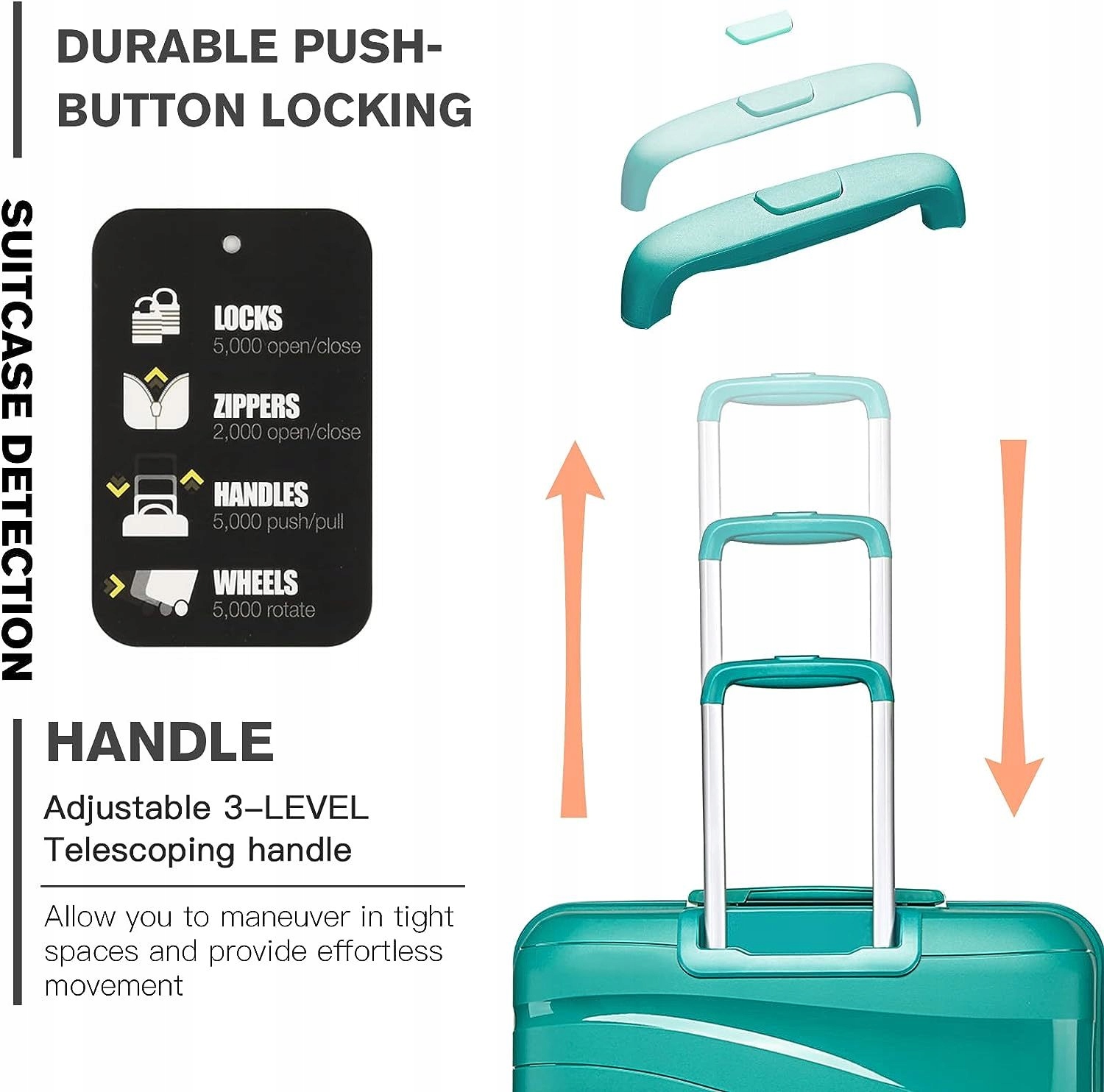 - Тихие поворотные колеса + алюминиевая телескопическая ручка + короткая ручка: Воспользуйтесь преимуществами нового мягкого ТПЭ и смазочных шариков в колесах: дорожный чемодан движется очень тихо и плавно благодаря вращающимся на 360° двойным колесам. Алюминиевая телескопическая ручка прочнее и легче, боковая ручка может быть очень удобной при поднятии тяжелого чемодана.