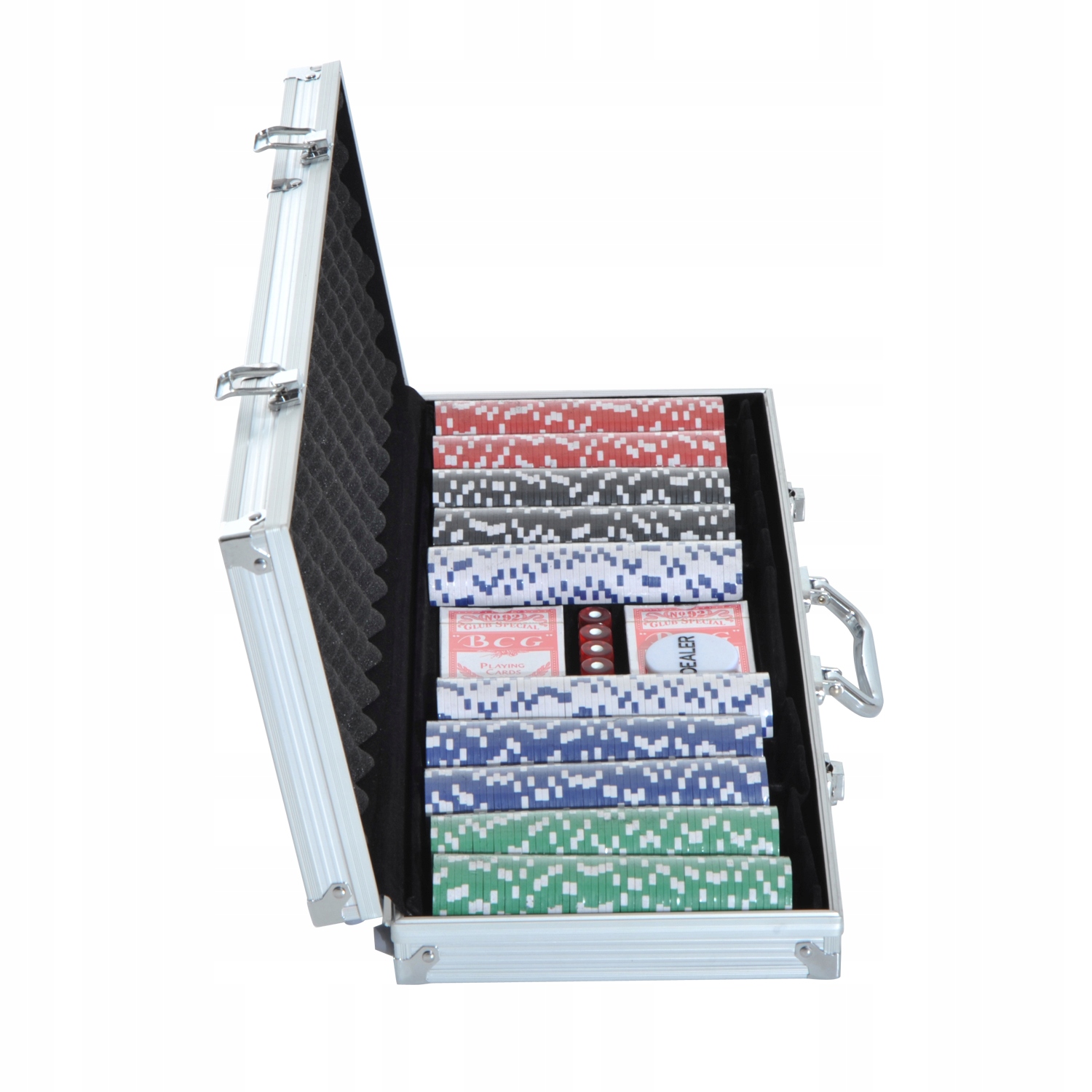 Наш покерный набор состоит из 500 разноцветных игровых фишек, 2 комплектов карт, 5 игральных костей и одного диска с надписью дилера. Алюминиевый кейс оснащен ручкой и двумя креплениями, что облегчает транспортировку. В покер отлично подходит игра с друзьями и всей семьей.