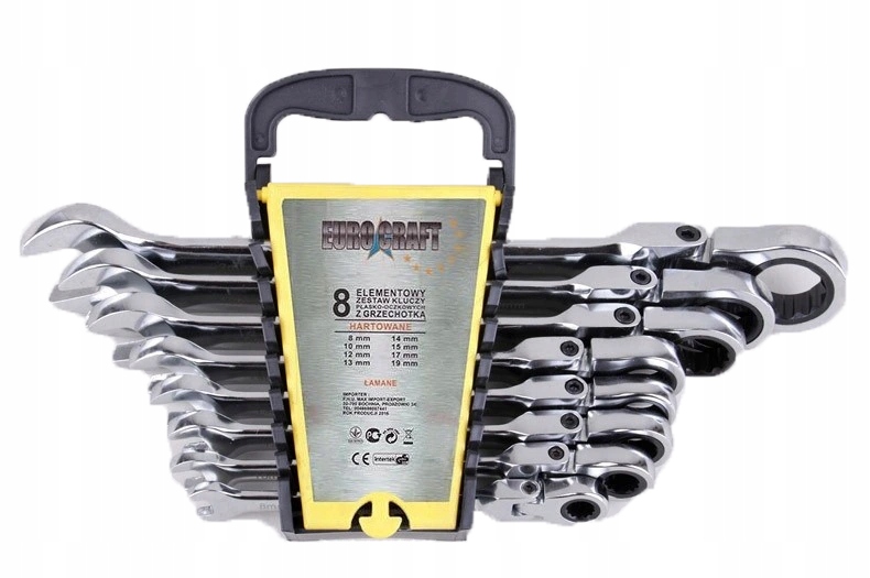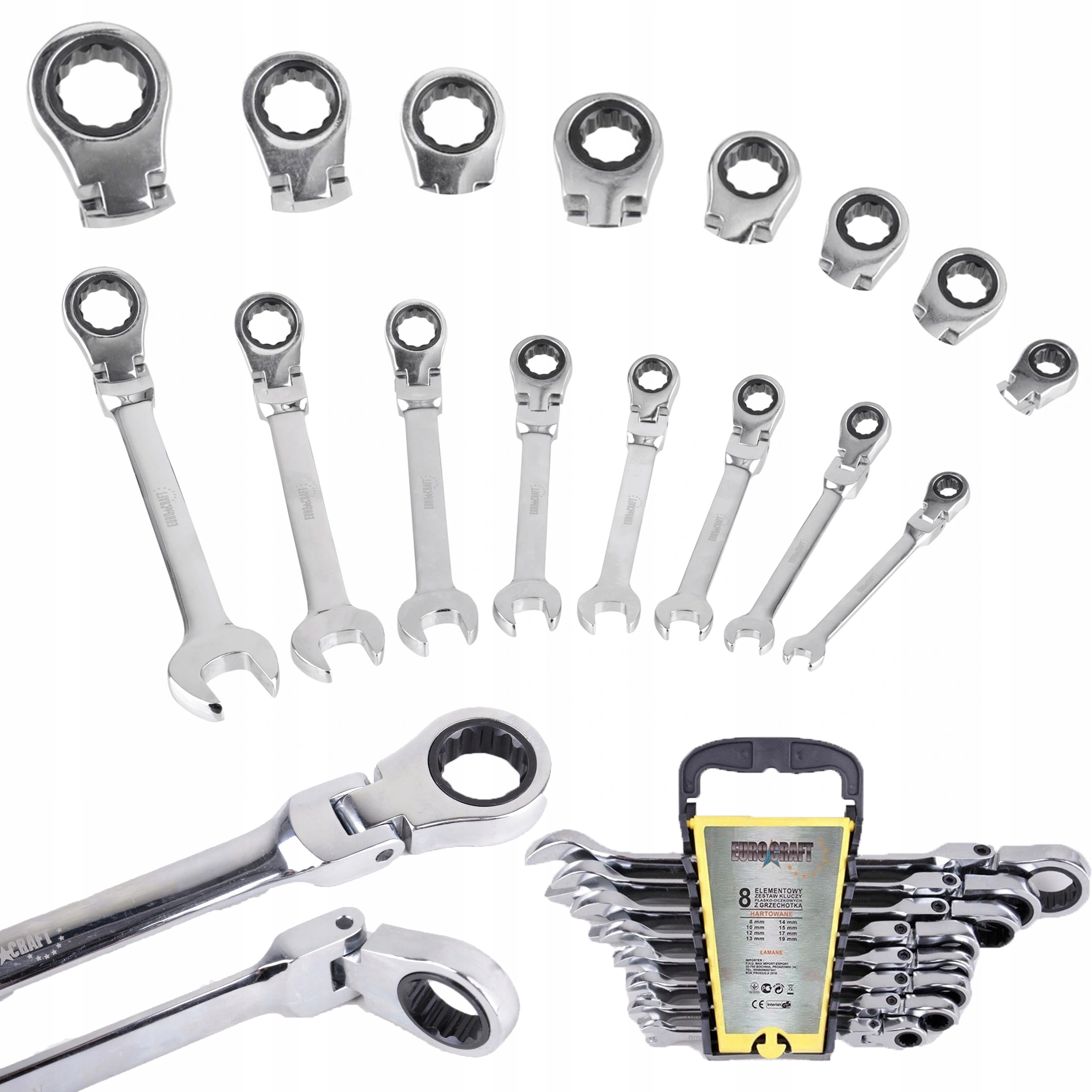 Набор из 8 комбинированных ключей с трещоткой. Чрезвычайно прочный реечный механизм изготовлен из закаленной стали. Храповой механизм точен и долговечен, благодаря своей конструкции обеспечивает ход ключа в 5°. Закрытый механизм устойчив к износу и повреждениям. В комплекте пластиковый органайзер.