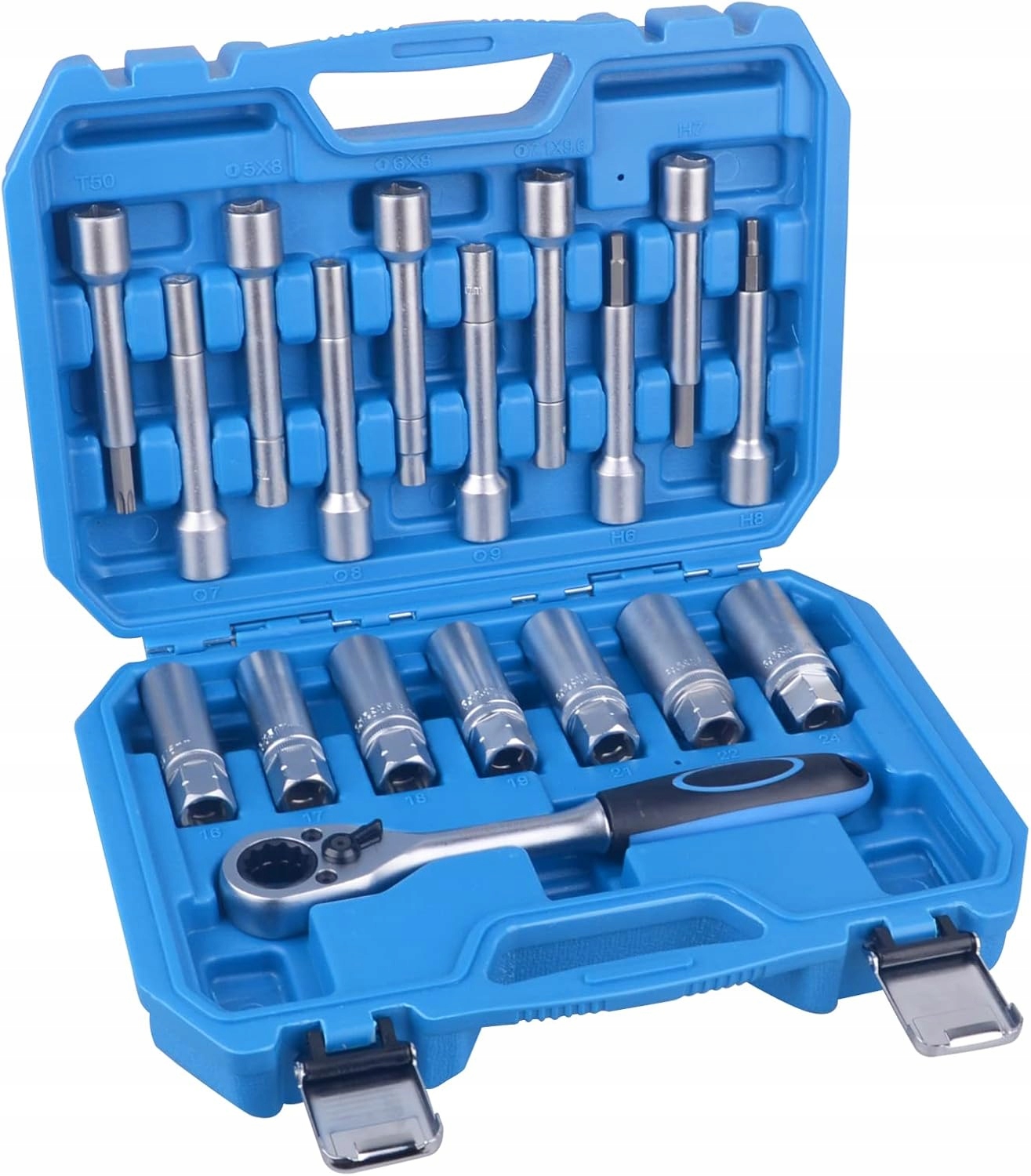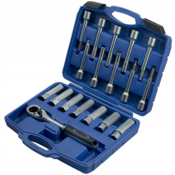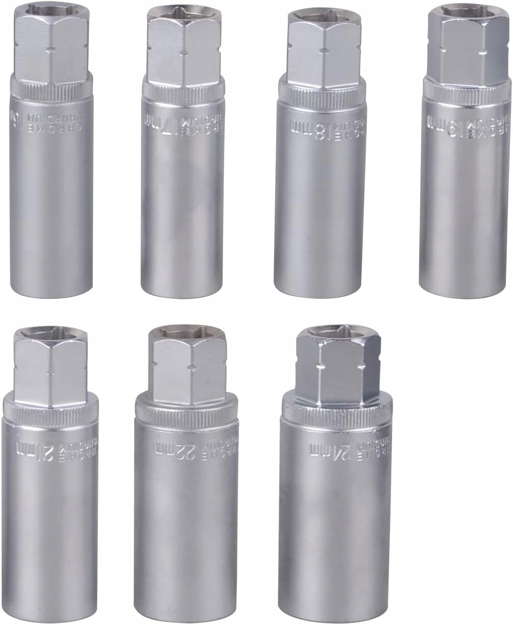 - 7 торцевых головок глубиной, шестигранный привод 12,5 мм (1/2 дюйма) и внешний шестигранник SW 21 мм, SW 16–17–18–19–21–22–24 мм.