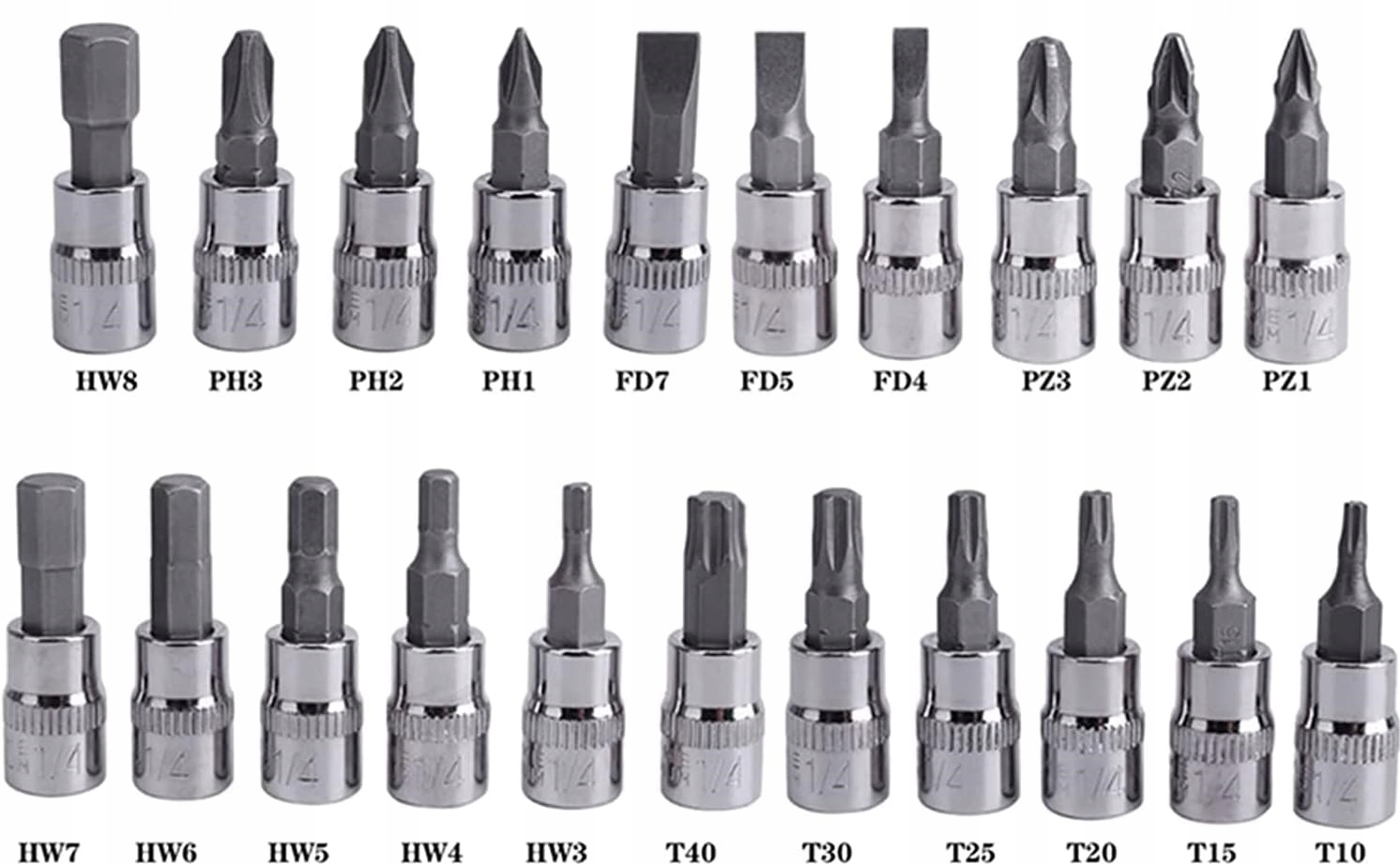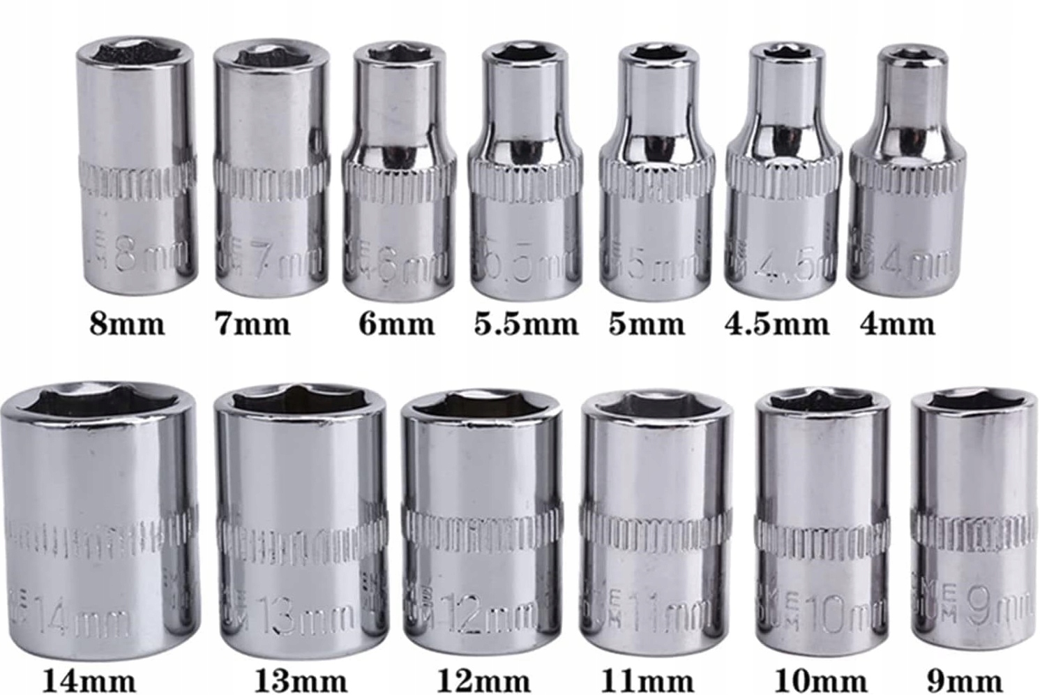 - Гнезда 1/4" 13 шт: 4; 4,5; 5; 5,5; 6; 7; 8; 9; 10; 11; 12; 13; 14 мм