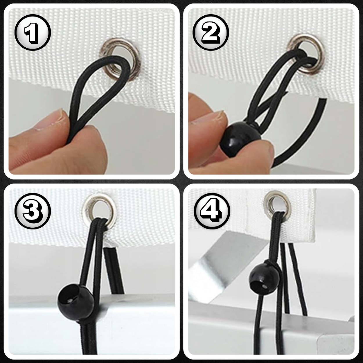 ✔️Простота использования:✔️Просто проденьте резинку через ушко брезента и закрепите ее с помощью шарика вокруг оправа делается быстро и просто, что позволяет сразу же прикрепить ее.