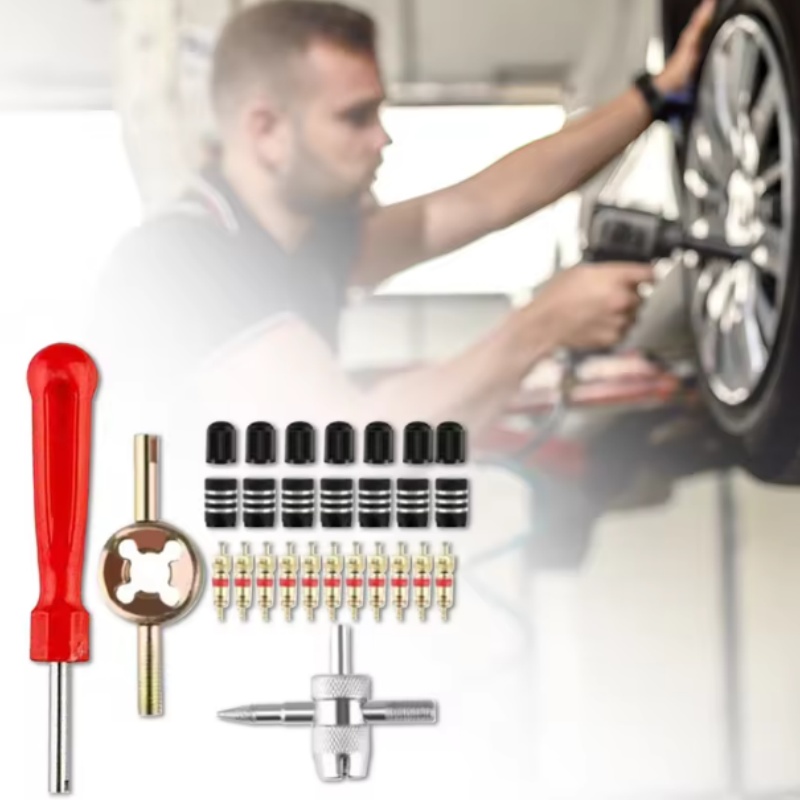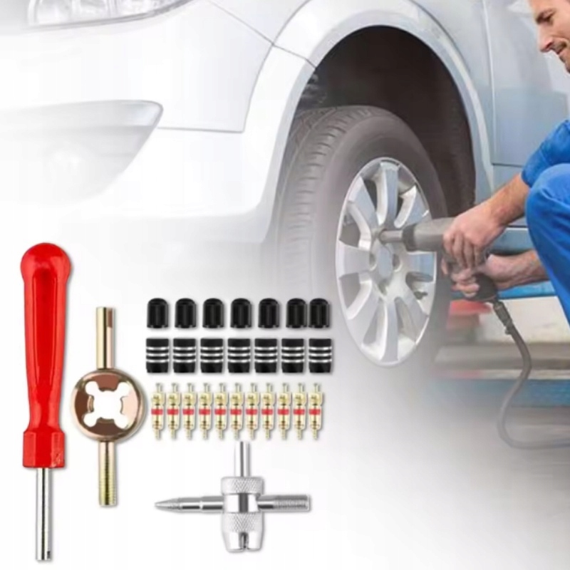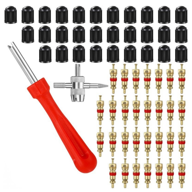- Комплект для ремонта клапанов шин: в комплект входят 1 ключ для клапана с одной головкой, 1 инструмент для 4-ходового клапана, 1 ключ для клапана, 34 колпачка клапана шины, 30 сердечника клапана.