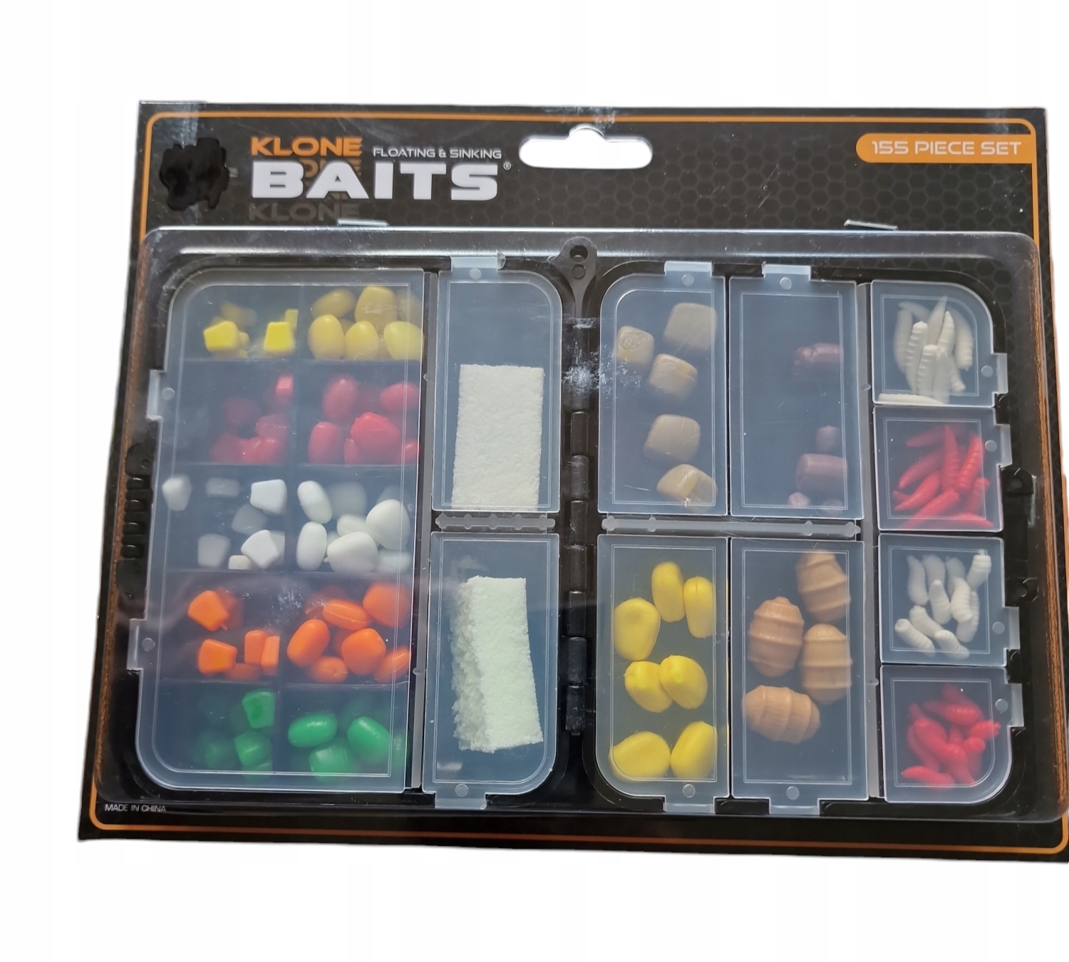 Клонные приманки — это, например, искусственные имитации приманки в виде хлеба, кукурузы, гранул и червей. Набор состоит из 155 деталей различных цветов, форм и размеров, некоторые из которых плавают, а некоторые тонут.