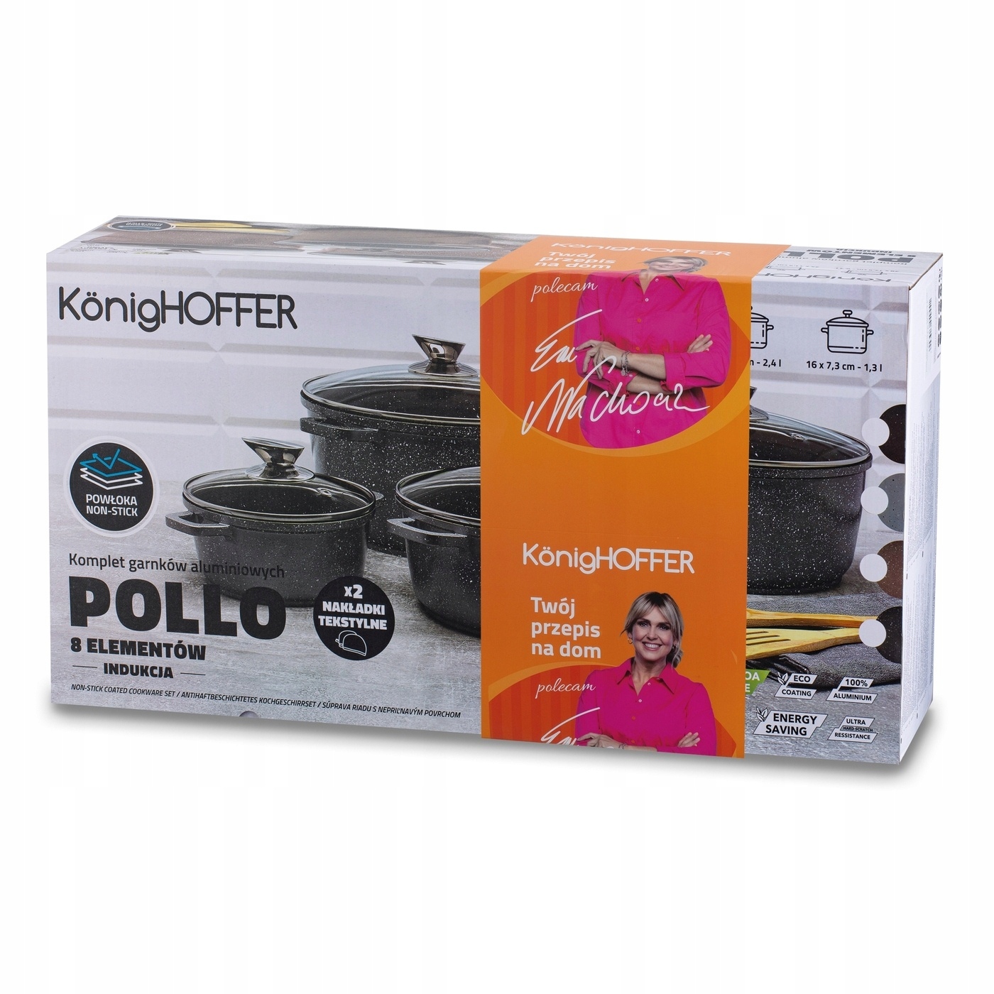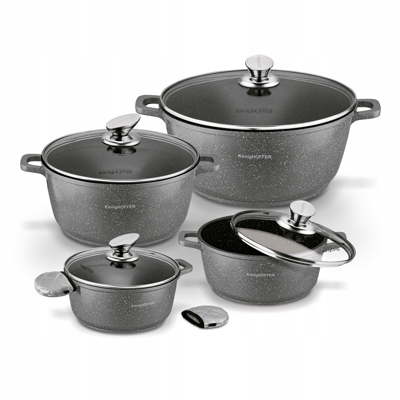 Набор мраморных кастрюль Konighoffer Pollo Grey из 8 предметов имеет 2 тканевые крышки на ручках. Набор позволяет безопасно готовить и жарить, снижая риск обжечь руки. В комплект входят сосуды емкостью от 1,2 до 6,3 л. Кастрюли поставляются со стеклянными крышками со стальным ободом для защиты от сколов. У них также есть стильные ручки из нержавеющей стали. С набором каменных горшков Pollo вы можете готовить на плитах любого типа. Гранитное антипригарное покрытие и отделка алюминиевого корпуса под мрамор добавляют элегантности. Они быстро нагреваются, поэтому вы сэкономите время и силы. Они идеально подходят для семейной кухни или в качестве подарка. Они также хорошо защищены от высоких температур и равномерно проводят тепло. Вы также можете использовать кастрюли в духовке при температуре не выше 220 градусов C. Их безопасное использование и нетоксичный для окружающей среды дизайн отмечены маркировкой PFOA Free. Литые ручки являются неотъемлемой частью корпуса посуды. Поскольку никаких дополнительных соединений у них нет, они нагреваются вместе с кастрюлей. Поэтому при перемещении прибора к плите и обратно, а также при извлечении его из духовки необходимо использовать защитные чехлы (тканевые, силиконовые) или кухонные перчатки, чтобы не обжечь руки. Естественно, что будет ощущаться некоторая жара. Однако его уровень тогда будет поддерживаться на безопасном уровне. Продукт рекомендует Ева Вахович. Как амбассадор бренда Konighoffer, она горячо и с улыбкой рекомендует его для домашнего использования. Вместе с ним вы получите свой рецепт для дома. Это один из лучших вариантов в этой категории!