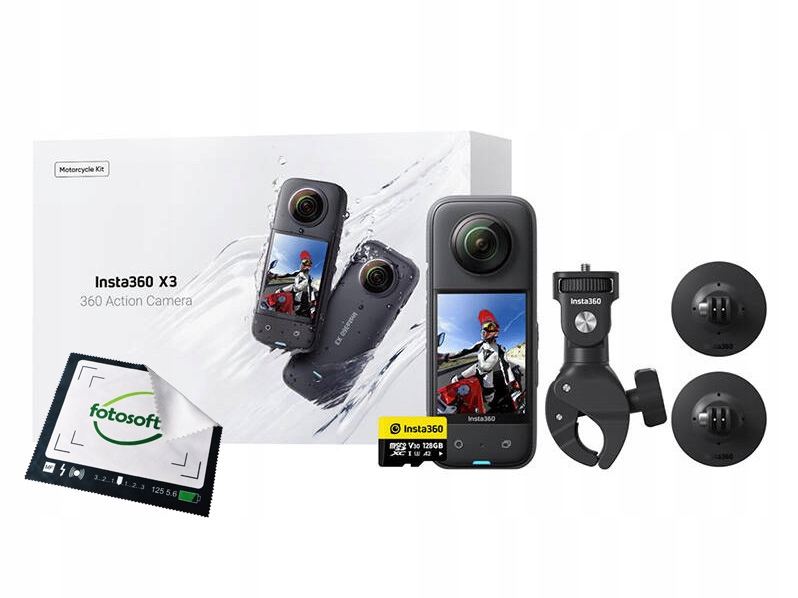 Предлагает высококачественную запись видео на 360 градусов. Он станет идеальным выбором для любителей динамичной деятельности, обеспечивая отличную стабилизацию изображения, множество практичных режимов и возможность мгновенного редактирования материалов. В комплект поставки также входит набор креплений на руль, крепление для шлема и карта памяти на 128 ГБ. Это фантастический вариант для любителей мотоциклов, которые хотят записывать свои поездки!