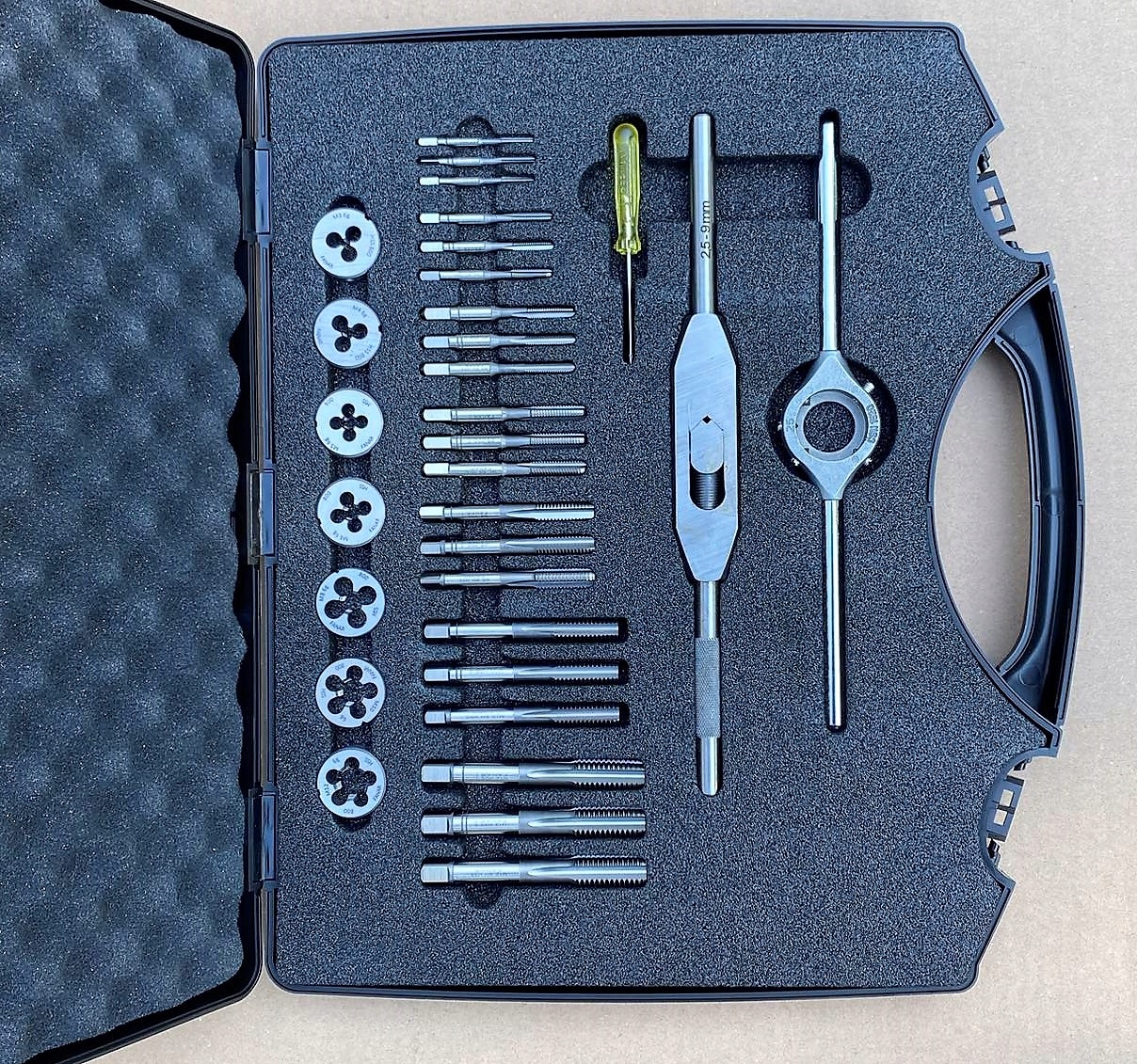Набор матриц и метчиков размерами М3-М12 производства FANAR с наименованием производителя CZB-31 HSS — это набор профессиональных инструментов для нарезания резьбы, применяемых на профессиональных заводах, в мастерских и инструментальных цехах, где обеспечивается повторяемость размеров и соблюдение допусков и точности. требуется внутренняя и внешняя резьба.
