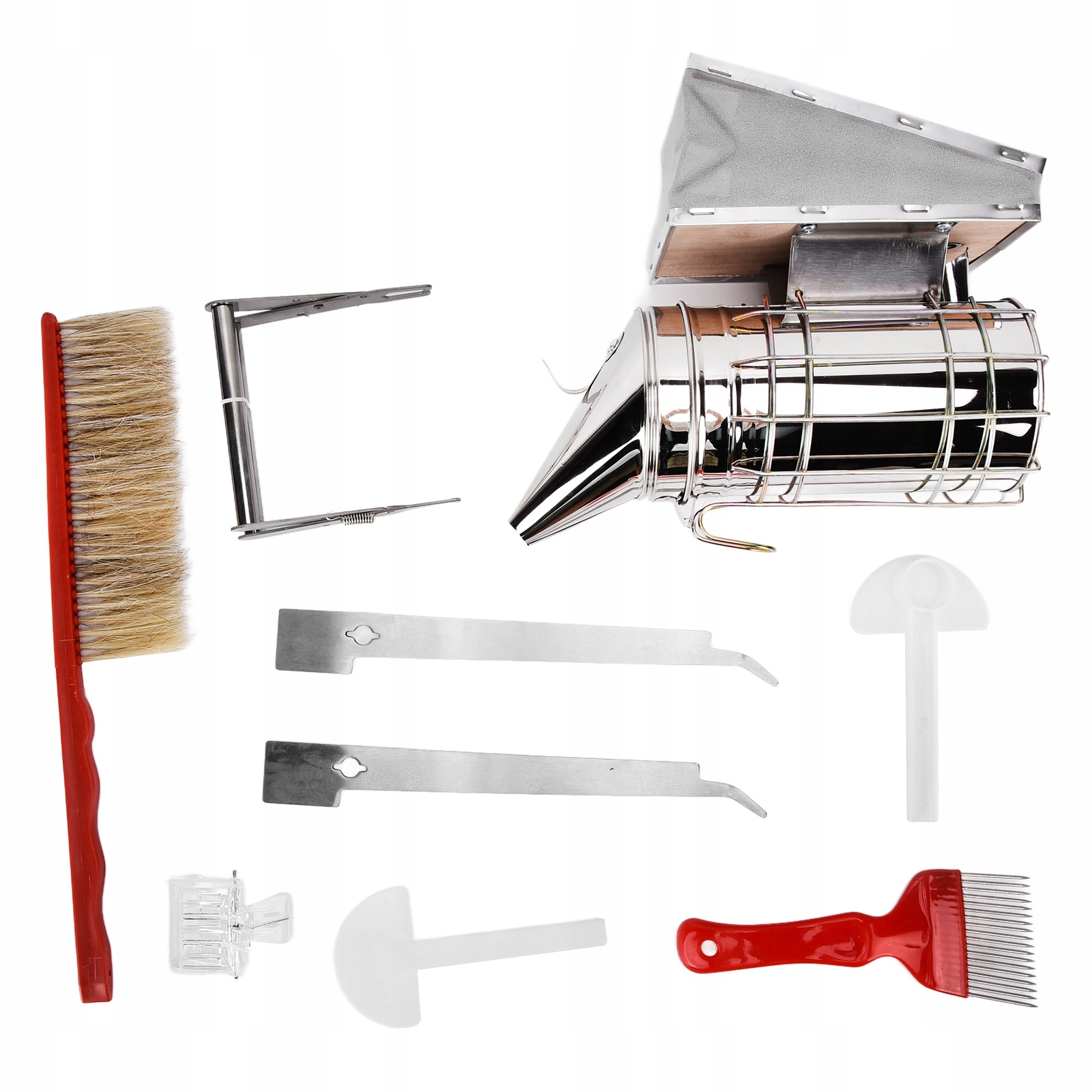 Особенность:1. Набор для пчеловодства: включает в себя зажим для рамки соты, красный игольчатый нож, поилку для воды, щетку для подметания пчел, скребки, коптильню для улья из нержавеющей стали и насадку пчелиной матки.