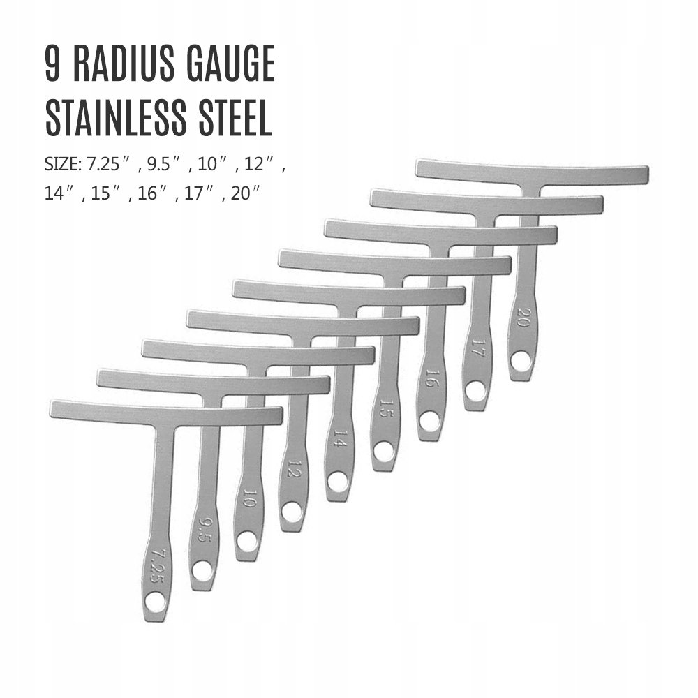 3. 9 Измеритель радиуса: датчик радиуса из нержавеющей стали, набор из 9 штук, включая: радиус 7,25 дюйма, 9,5 дюйма, 10 дюймов, 12 дюймов, 14 дюймов, 15 дюймов, 16 дюймов, 17 дюймов и 20 дюймов.