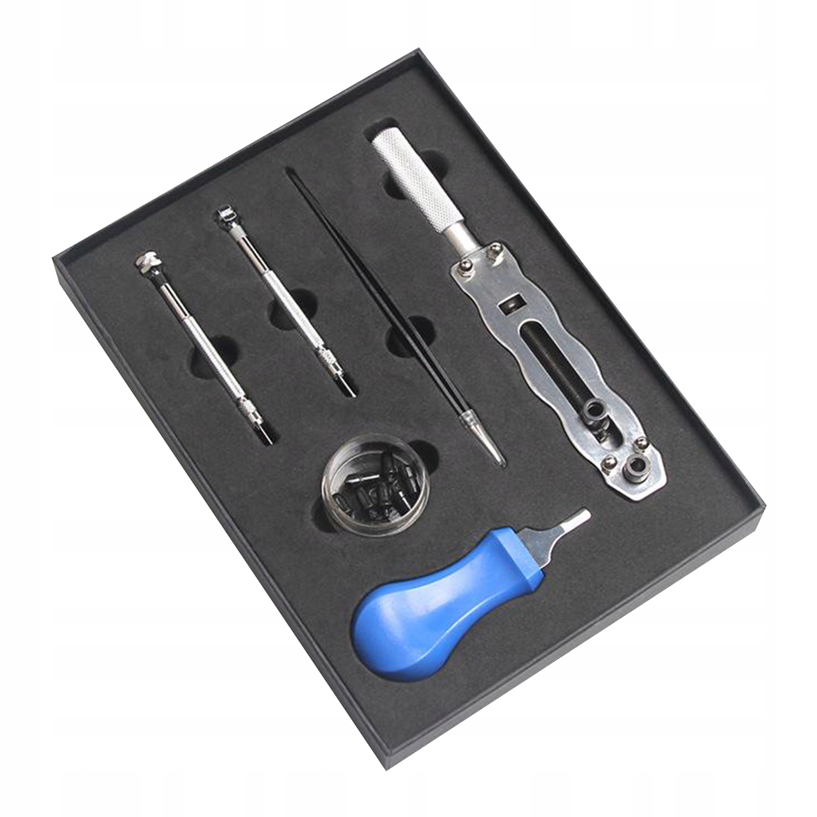 Каждый набор содержит 1 ключ для снятия задней крышки часов и 1 лезвие для снятия задней крышки часов. , 1 пинцет, 2 мини-отвертки, 1 коробка с патронами по 8 шт.