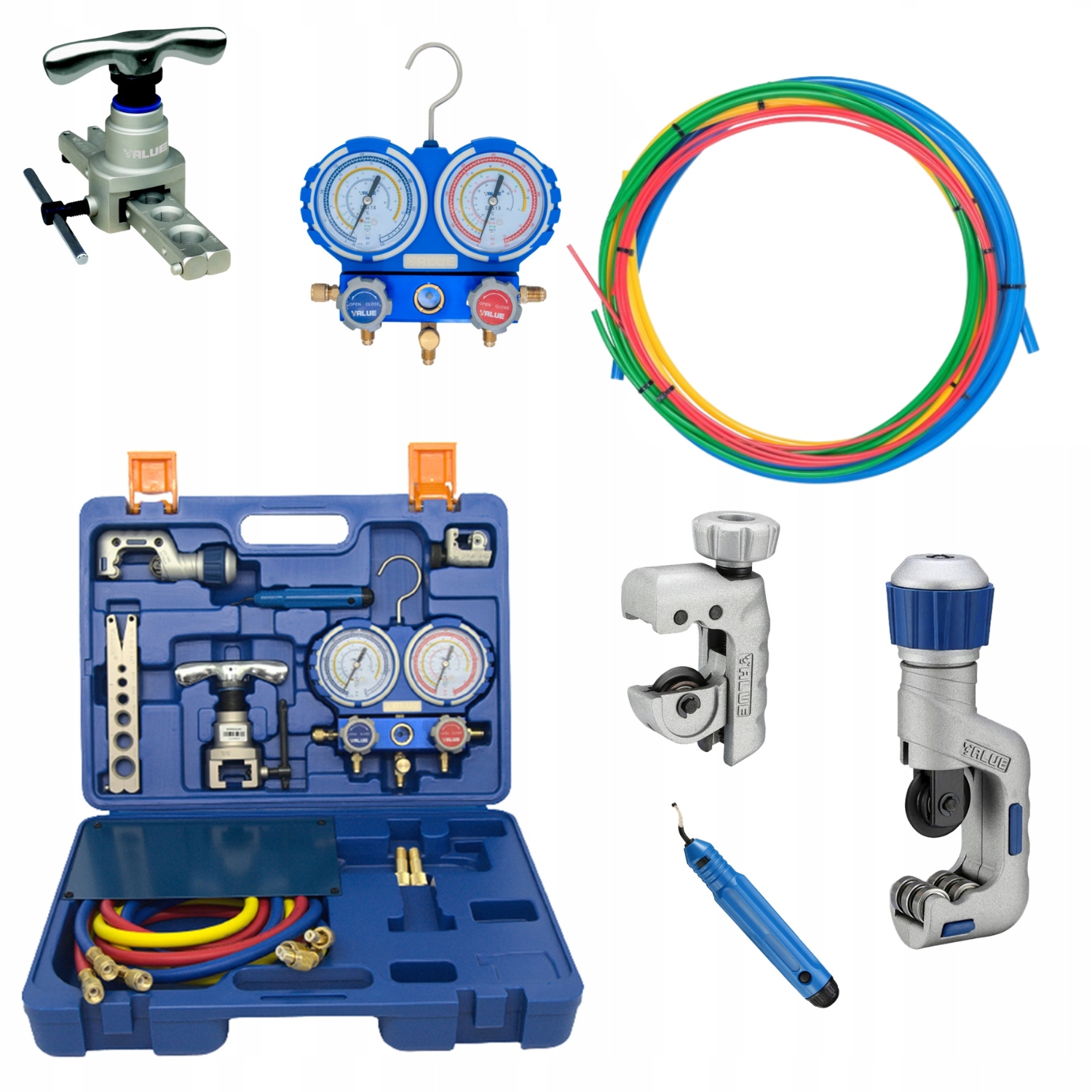 - В комплект инструментов входят: 1 развальцовка, 2 трубореза, 1 манометр, 3 сервисных шланга, 1 устройство для снятия заусенцев, 1 пластиковый чемодан.