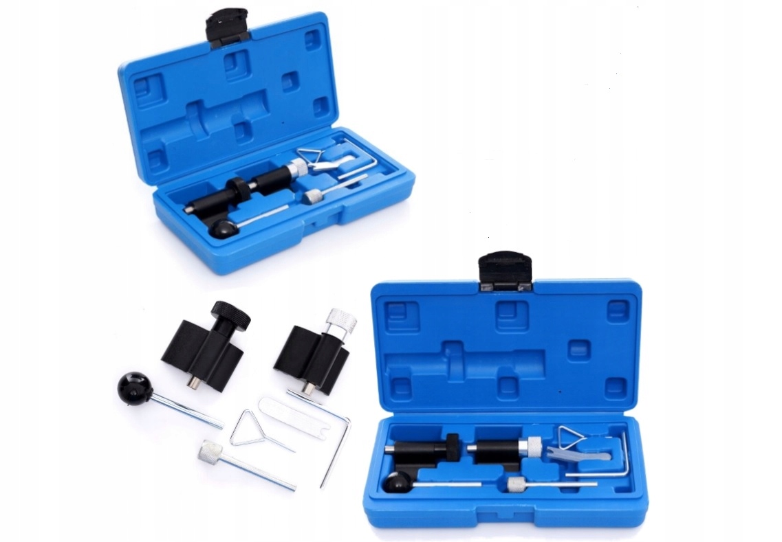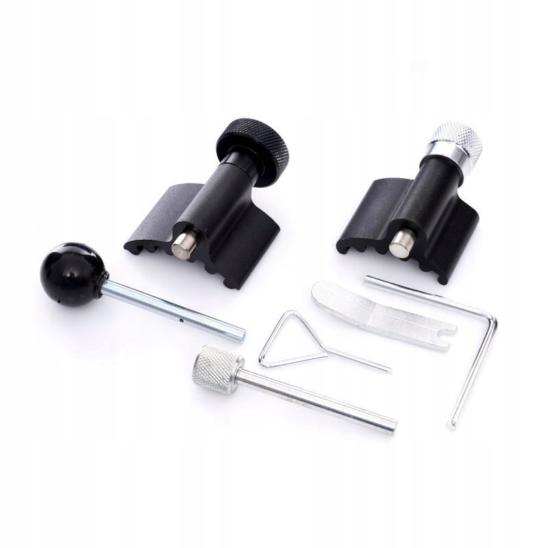 Комплект предназначен для замены ремня ГРМ в специализированных автосервисах. Обеспечивает фиксацию шестерен в сервисном положении. Благодаря своей форме он позволяет точно выставлять контрольные точки зажигания. 4 замка фиксируют шестерню и коленчатый вал, а штифт фиксирует натяжитель ремня.