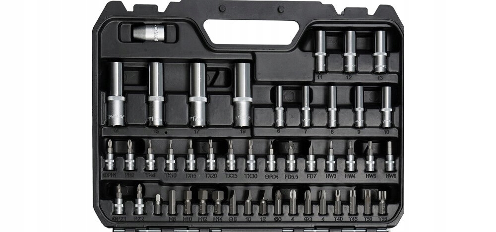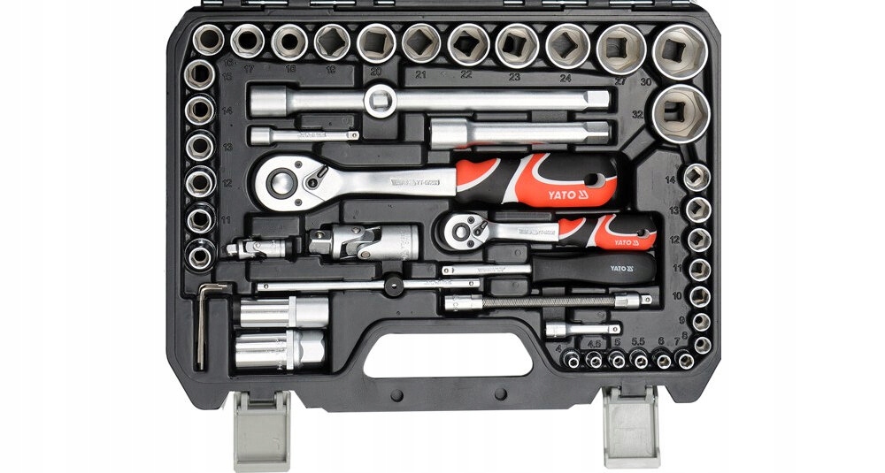 В набор инструментов YATO YT-12681 входят: головки, трещотка 1/2 дюйма и трещотка 1/4 дюйма, скользящая ручка, ручка отвертки, удлинители - 1/2 дюйма, 1/4 ала и гибкие, головки свечные, карданный шарнир, переходник, переходники для бит, насадки для отверток - TORX, Philips, Pozidriv, плоские и шестиугольные, а также шестигранные ключи, биты, чемодан и документация.