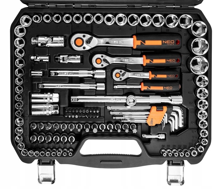 Набор торцевых ключей от NEO Tools, состоящий из 156 предметов, представляет собой полный набор инструментов, предназначенный для точного ремонта в различных местах. В комплект входяттри изогнутые трещотки с эргономичной ручкой, оснащенные храповым механизмом с 90 зубцами, что позволяет выполнять точную работу в труднодоступных местах. Кроме того, в набор входят комбинированные ключи, накидные ключи с трещоткой и шестигранные ключи.