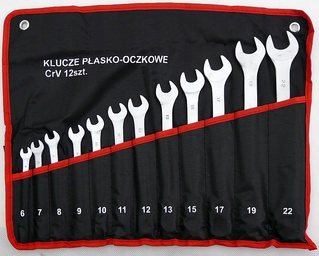 Набор комбинированных ключей упакован в удобный сворачивающийся кейс, поэтому занимает мало места. Отверстия в верхних углах корпуса позволяют повесить ключи на стену. Чехол изготовлен из очень прочного и долговечного материала. В набор входят ключи самых популярных размеров.