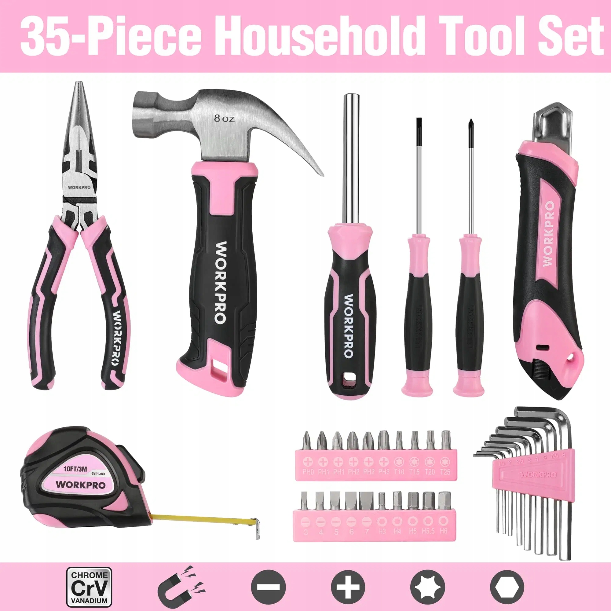• Набор инструментов WorkPro с 35 частями содержит стандартные ручные инструменты: молоток, измерительная лента, резка нож, плоскогубцы, отвертка и ключ Allen