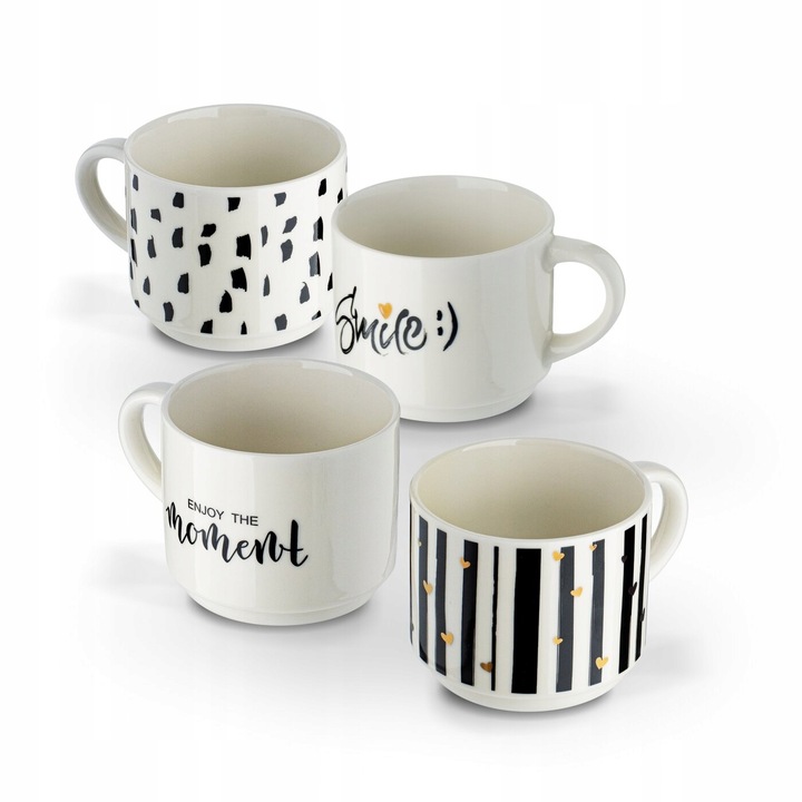 Набор состоит из четырех чашек , идеально подходящих для кофе или чая из белого фарфора. чашки отличаются друг от друга в шаблонах. В целом хранится черно -белые цвета с добавлением золотых деталей.