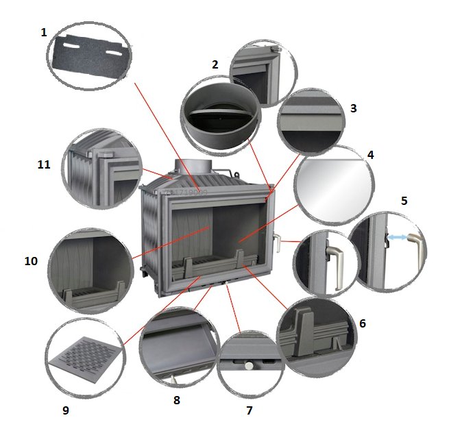 11. Материал: чугун – прочный, долго сохраняет температуру. Стенки камина толщиной минимум 8 мм гарантируют безаварийную работу топки. Плотно расположенные радиаторы – благодаря им камин передает больше тепла в окружающую среду.