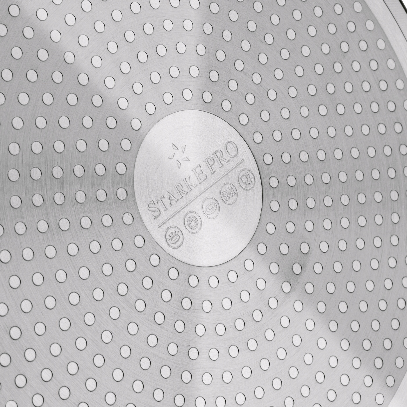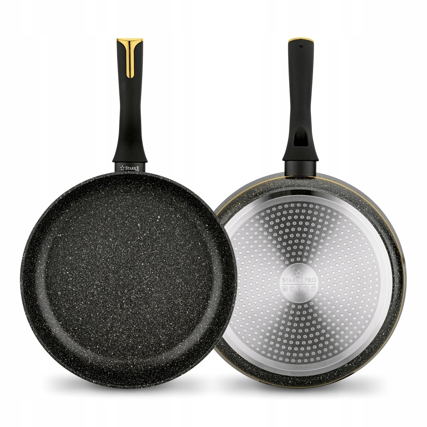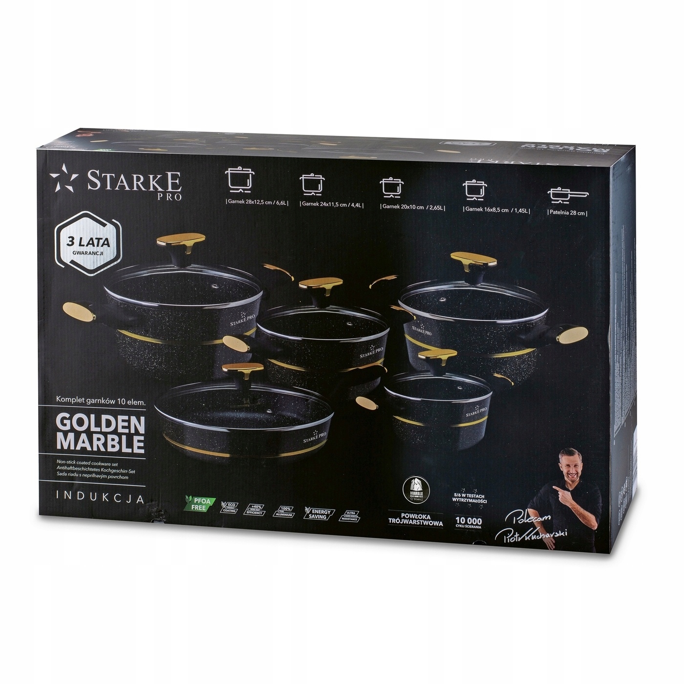Набор индукционных кастрюль Starke Pro Golden Marble из 10 предметов с антипригарным покрытием и крышками изготовлен из алюминия, имеет толстые стенки и защищает продукты от прилипания. Корпуса, которые он использует, изготавливаются горячей ковкой из одного листа металла с использованием техники ковки. Благодаря этому 4 кастрюли и сковорода диаметром 28 см очень прочные и хорошо проводят тепло. Они также идеально сбалансированы, что в сочетании с ненагревающимися и нескользящими ручками Soft Touch обеспечит вам высокий уровень комфорта использования. Набор работает на любом типе плиты, поскольку в нем используется индукционное дно. Это ускоряет приготовление блюд и экономит электроэнергию. Долговечность внутренней поверхности посуды из коллекции Golden Marble основана на трехслойном антипригарном покрытии MARBLE PLUS. Он не содержит вредных веществ (например, ПФОК), тверд, имеет отличную адгезию и естественную текстуру, выдерживает до 10 000 циклов истирания. За ним также легче ухаживать (нельзя мыть в посудомоечной машине, только ручная стирка). В комплект также входят 5 специальных стеклянных крышек со стальными краями. Благодаря им можно тушить продукты и удобно регулировать количество пара внутри кастрюль или сковородок. Серию Starke Pro Golden Marble с каменным покрытием также протестировал профессиональный шеф-повар Петр Кухарский. Он рекомендует его для длительного использования на домашней кухне. На комплект распространяется гарантия производителя 3 года - 5/6 звезд по общим тестам качества и красивый дизайн, сочетающий рисунок черного мрамора и элементы золотого цвета!
