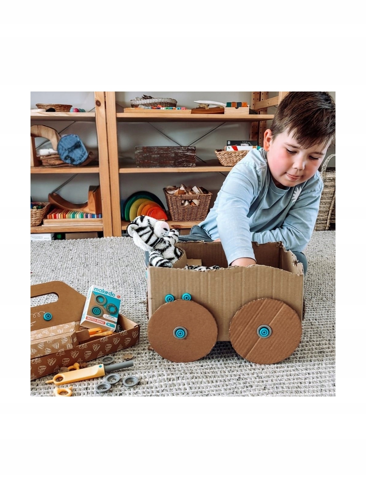 Уникальная соединительная система Makedo основана на специальных винтах, которые позволяют соединять различные материалы (картон, пластик и т. д.) без использования клея или ленты. Это экологический подход к игре, который учит детей использовать предметы повседневного обихода и дает им новую жизнь.