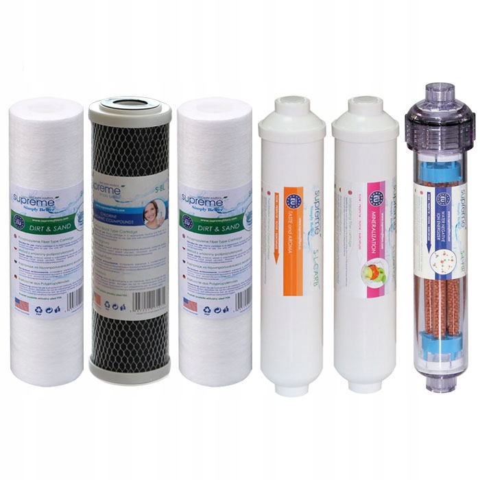 FRO5A2000- CRT-SUPREME - Комплект картриджей с ионизатором. Предназначен для работы с системами обратного осмоса (RO7 с минерализующим и ионизирующим картриджем). В комплект входят шесть картриджей: три картриджа предварительной фильтрации S-PP20, S-PP5 и S-BL, линейный обогащающий картридж, линейный минерализующий картридж и линейный ионизирующий картридж. Картриджи предварительной фильтрации удаляют такие примеси, как: песок, ржавчина, взвеси размером не менее 5 мкм, хлор, некоторые пестициды, фенол, бензол. Обогащающий картридж придает воде неповторимый вкус и запах. Линейный минерализующий картридж обогащает воду необходимыми для организма человека элементами, такими как: кальций, магний, натрий, калий. Биокерамический картридж 2000, принимает участие в очищении организма от токсинов, способствует выведению свободных радикалов, способствующих более быстрому старению организма или образованию онкологических заболеваний.