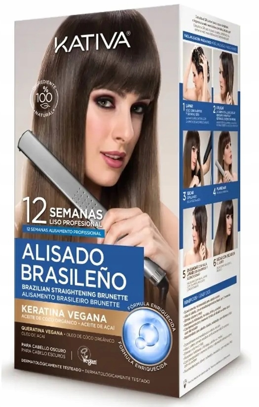 Kativa Alisado Brasileno Брюнетка — набор для кератинового выпрямления каштановых и темных волос. В наборе 4 косметических средства, которых хватит на одну процедуру выпрямления. Эффект продлится до 10 недель! Волосы будут удивительно гладкими, блестящими, как гладь воды, легко поддающимися укладке и идеально прямыми.