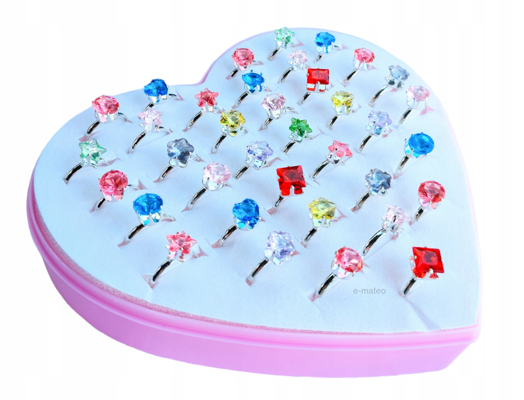 - 36 колец с блестящими элементами помещены в коробочку в форме сердца.