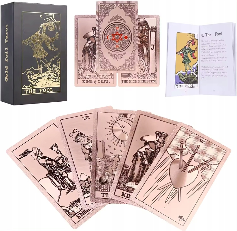 Новые карты Таро в розовом золоте - это Perfect b> для любителей эзотерического искусства. Эта мистическая колода карт сочетает в себе необычайную гармонию цветов само по себе, подчеркивая красоту и тайну сообщения, содержащиеся на отдельных картах. Чрезвычайно тщательно детали с золотыми мотивами добавляют роскошные характеристики к уникальному продукту .