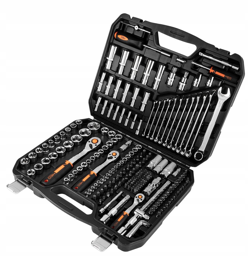 Набор торцовых ключей NEO 1/2", 3/8" и 1/4" (арт. № 10-076) состоит из 219 элементов, изготовленных из высококачественной хромованадиевой стали.