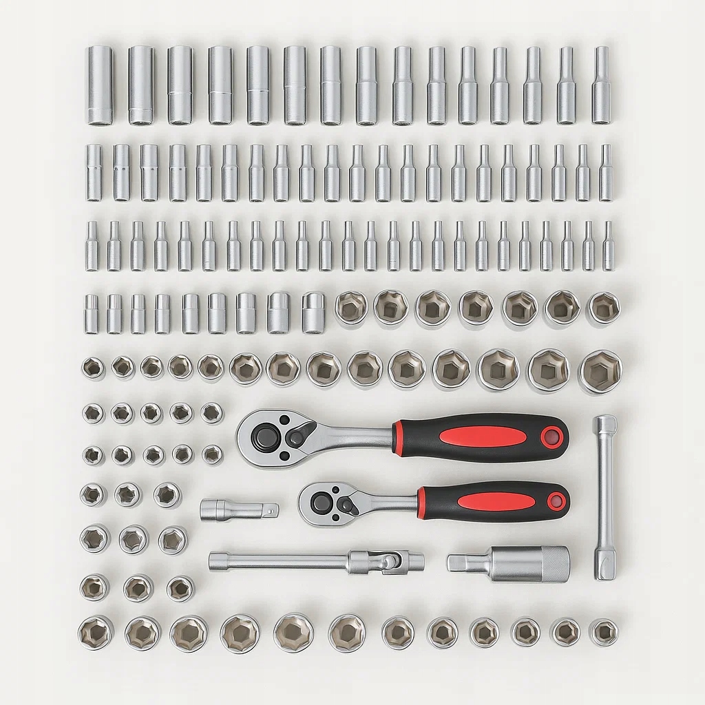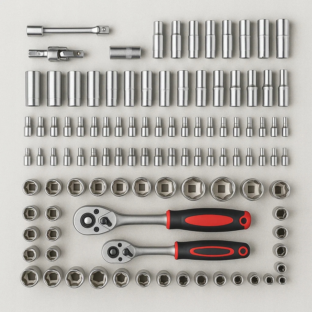 - Гнезда, трещотки, шестигранные ключи, удлинители, соединения, ручки и т. д.