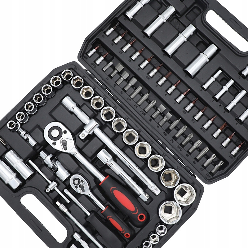 - до 94 элементов различных размеров, включая головки, удлинители, трещотки, шестигранные ключи и многие другие.
