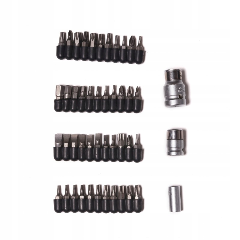 - биты 5/16 " - 30 шт.: Hex 5,5, 6, 6,5, 7, 8, 10, 12 мм; SL 6, 6,5, 8 мм; PH 3, 4; Pz 3, 4; 47, 30, 35, 40, 40, 40, 40, 40, 40, 40, 40, 40, 40, 40, 45, 45, 45, 45, 45, 40, 40, 47, 47, 40, 40, 47, 40, 47, 40, 47, 47, 45, 47, 47, 47, 47, 47; 40, 45, 50; Pz 0, 1, 2, 3; HEX: 2, 2,5, 3, 4, 5, 6, 7, 8 мм; SL 3, 4, 5, 5,5, 6, 6,5, 7, 8 мм; 6, 8 мм; 45; 8, 9, 10, 15, 20, 25, 27, 30, 40, 45