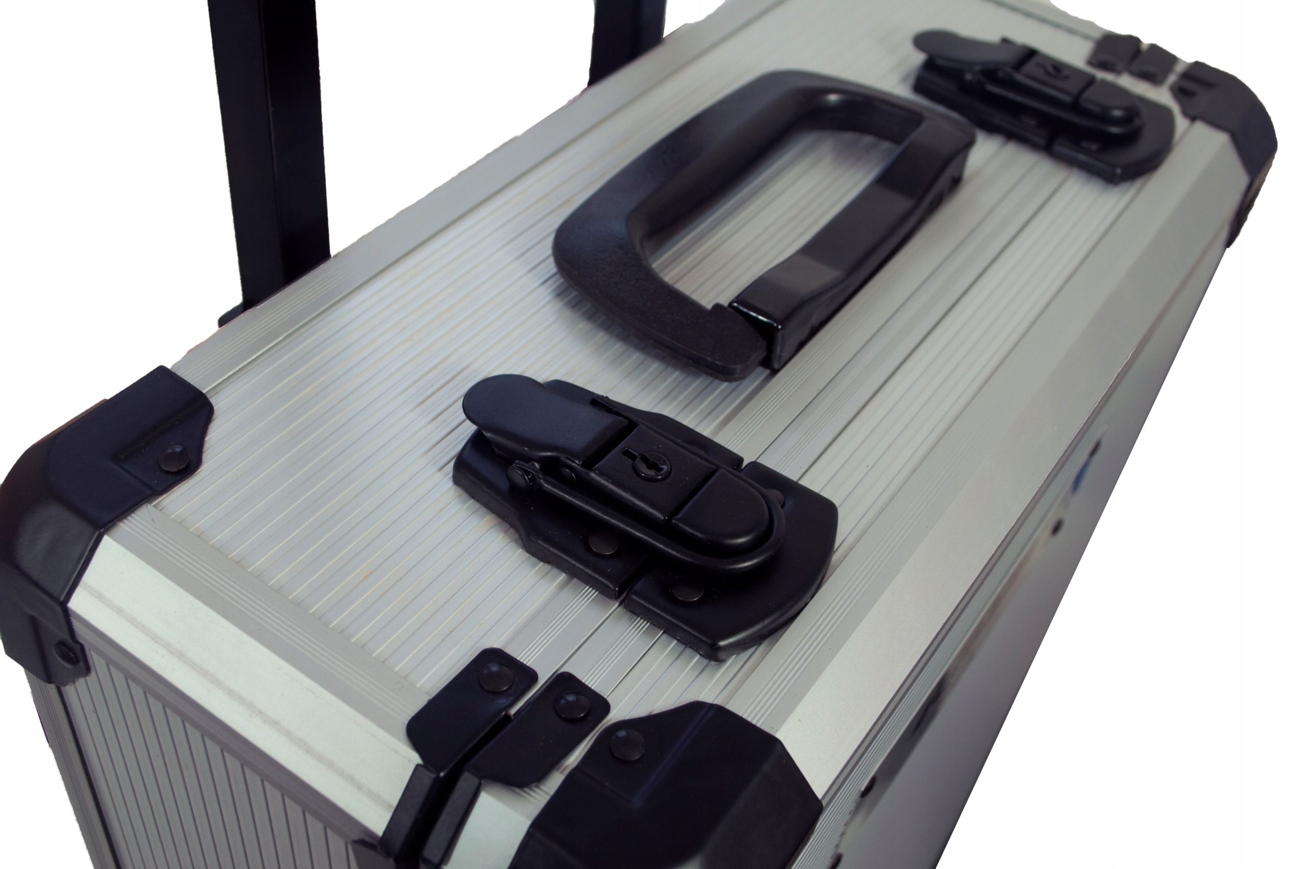 ✔️ Прочный корпус: Алюминиевый кейс с колесиками и выдвижная ручка для удобства транспортировки.