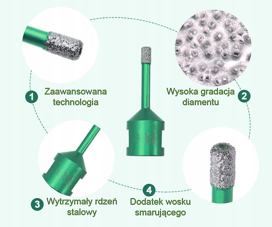 Алмаз в коронках насажен методом вакуумной пайки. Это означает, что частицы алмаза внедрены в материал. Это не фораминиферы с ромбовидным покрытием, только на поверхности. Благодаря этому биты имеют длительный срок службы, а также устойчивы к высоким температурам – их можно использовать в сухом виде на высоких оборотах шлифмашины.