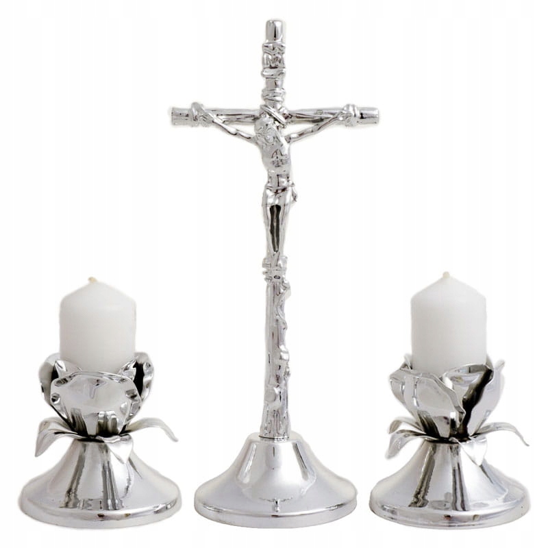 Колядный набор – важнейший элемент снаряжения во время пастырского визита в наш дом. Вышеуказанный комплект отличается интересным стилем. Крест похож на ветку розы, а подсвечники напоминают цветок розы. Вся вещь выполнена из блестящего серебра, как образ Иисуса.