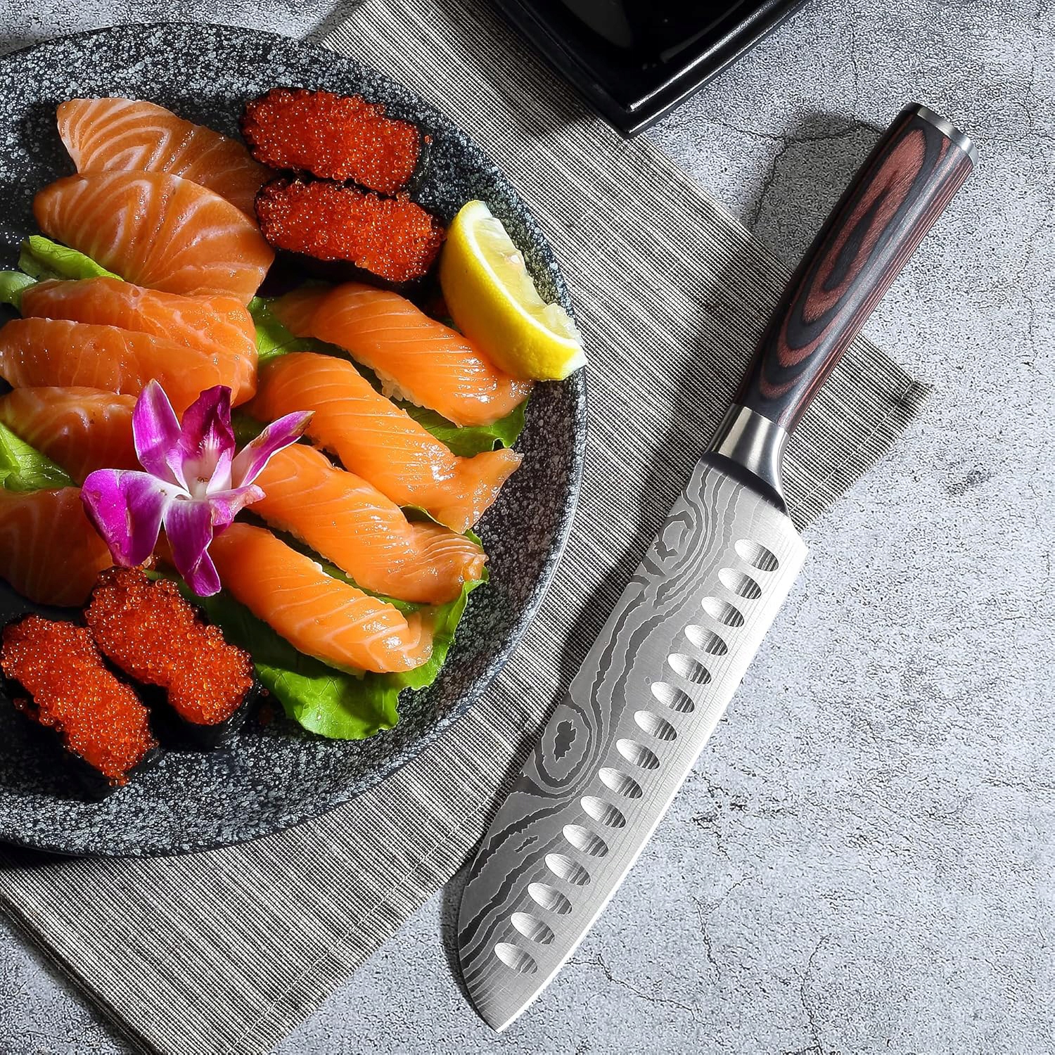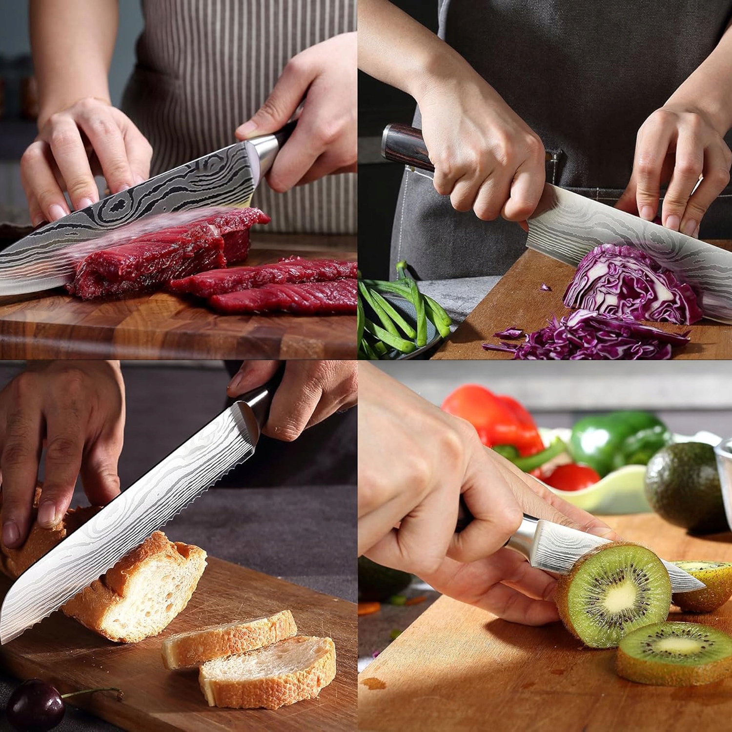 - Набор ножей премиум -класса включает в себя нож шеф -повара 20 см, 20 см нож Сантоку, универсальный нож 13 см, нож для хлеба 20 см, овощной нож 9 см.