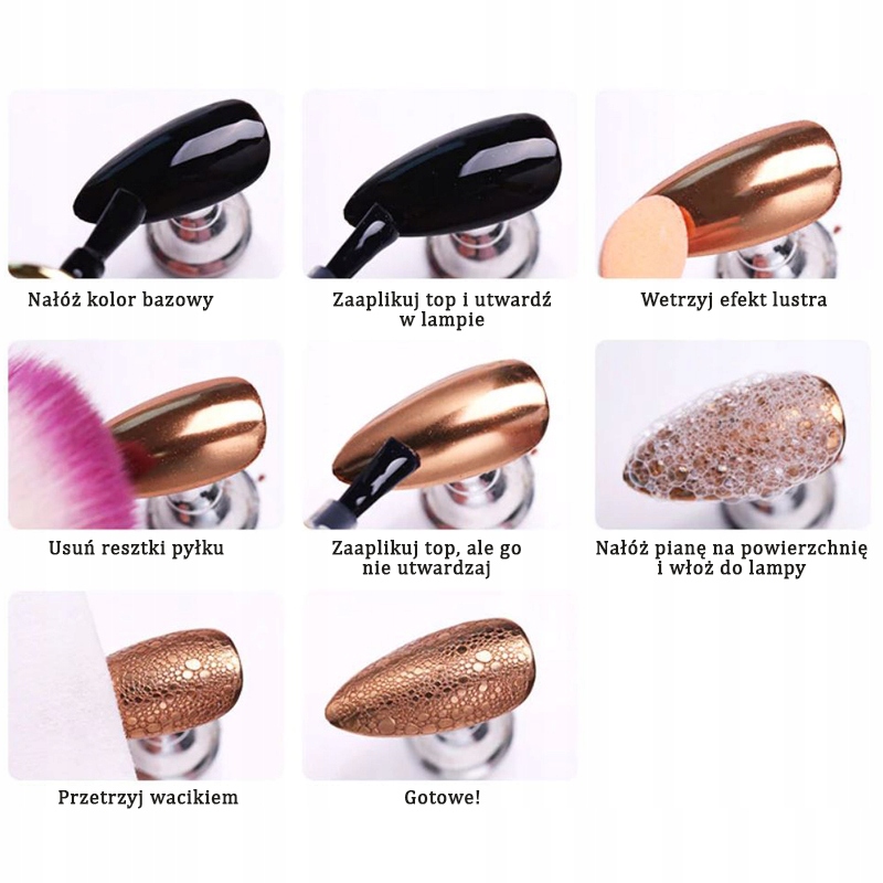 Покройте ногти черным лаком, а затем топом. Вотрите порошок и готово!