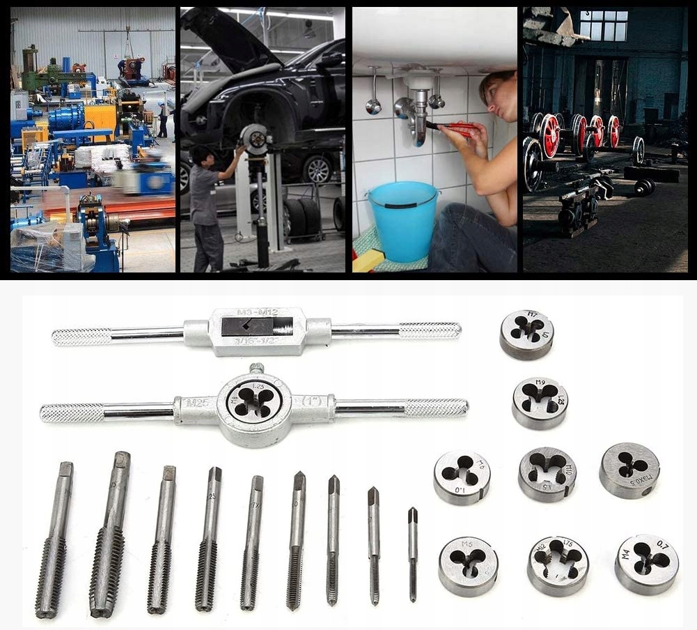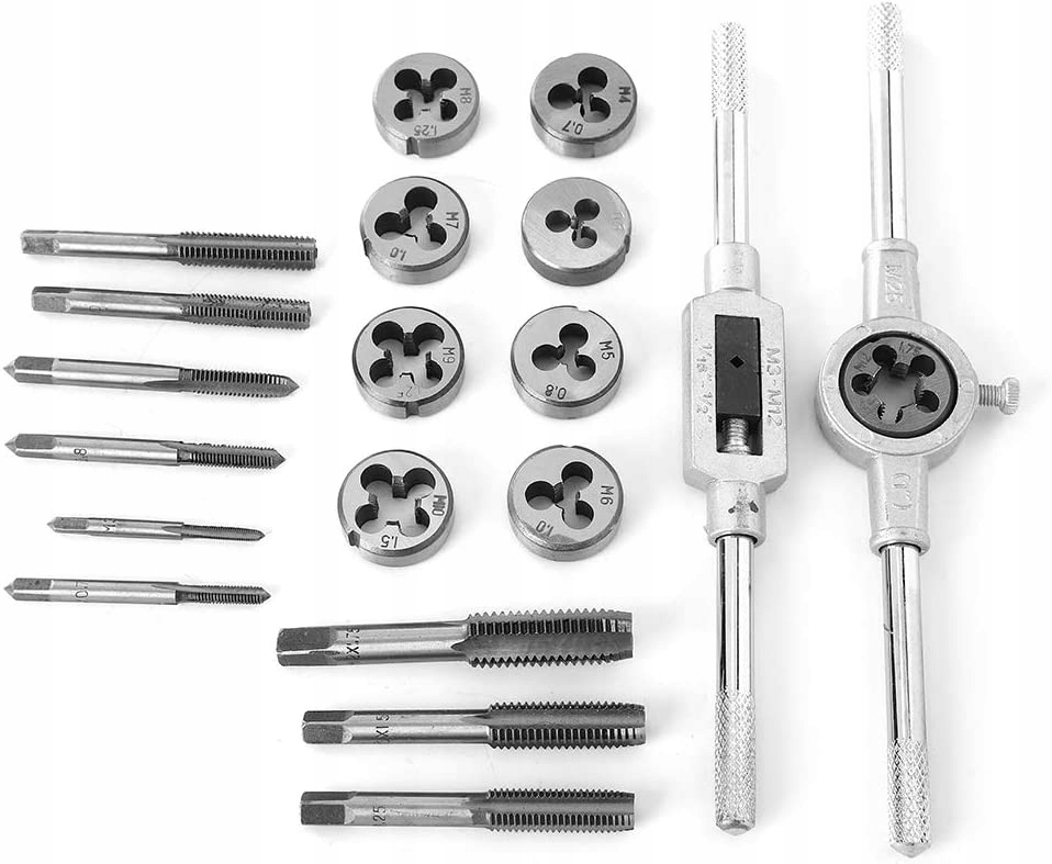 Набор метчиков и плашек пригодится не только в мастерской, но и в гараже любителя DIY. Теперь вы сможете самостоятельно сделать резьбу на выбранном элементе конструкции. Для изготовления внешней резьбы можно использовать плашки, а для внутренней резьбы — метчики. В комплект входят две рамы, позволяющие выполнять работу эффективно и безопасно. Инструменты изготовлены из специальной быстрорежущей стали соответствующей твердости.