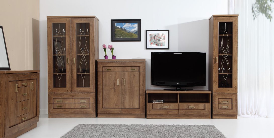TORINO 03 — комплект мебели для гостиной, состоящий из двух витрин, тумбы под телевизор и двух комодов. Мебель доступна в цветах дуба Лефкас и столетнего дуба. Корпус и фасады изготовлены из высококачественного ламинированного картона толщиной 16 мм. Столешница утолщена до 36 мм, на фасадах имеется декоративная полоса МДФ. Кромка из АБС-пластика повышает устойчивость к истиранию и влаге. Преимуществом системы являются металлические ручки и выдвижные ящики на роликовых направляющих. Витрина декорирована стеклом. Мебель упакована в пакеты, для самостоятельной сборки. В комплекте есть понятная инструкция.