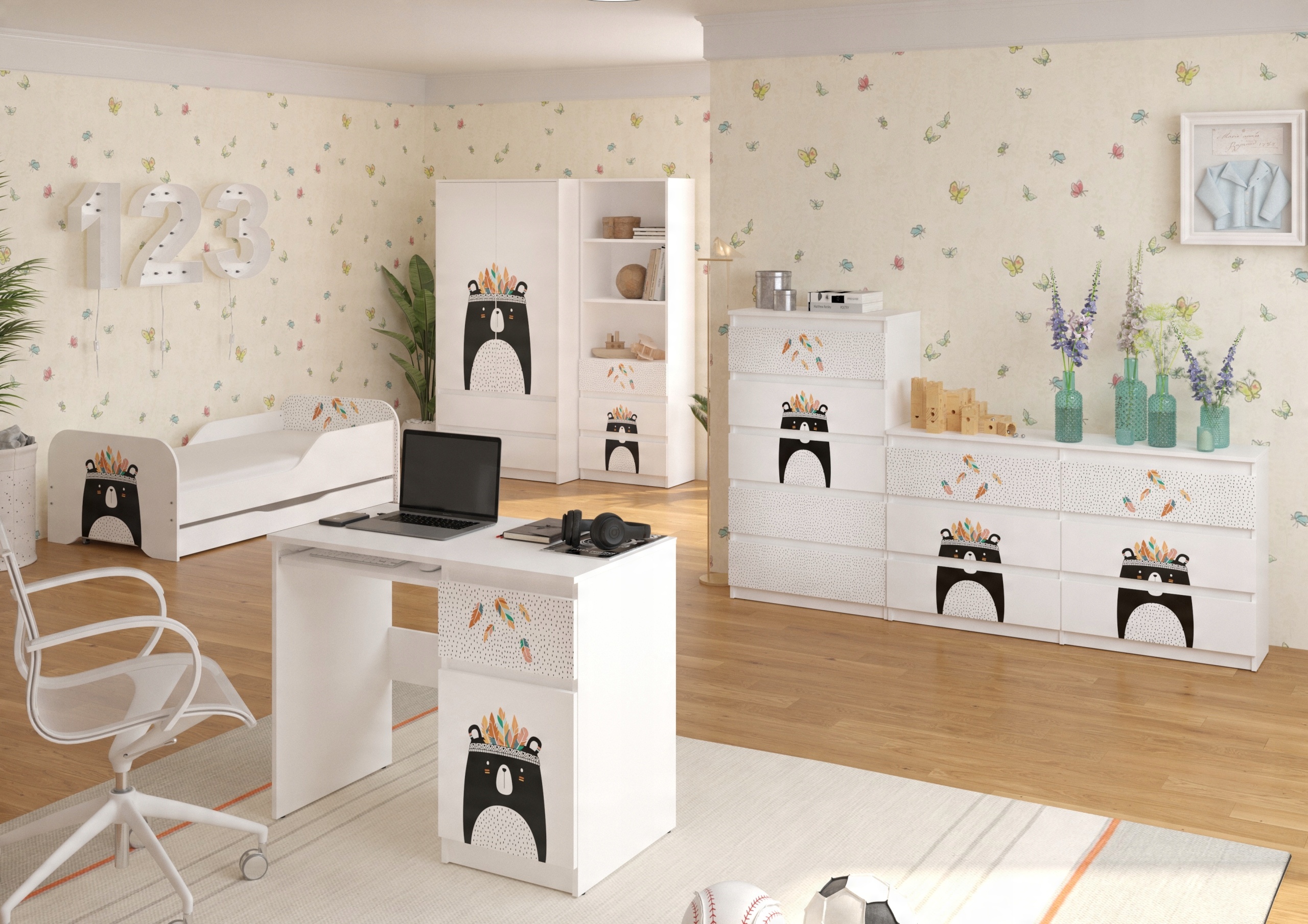 — практичный и функциональный предмет мебели, который найдет свое место в каждой детской комнате. Эргономичные размеры обеспечивают свободу обустройства помещения. Комод изготовлен из белого ДСП, отделанного шпоном. Состоит из пяти ящиков, установленных на направляющих, которые оснащены ограничителями, предотвращающими полное выдвижение. Дверцы комода украшены красочным принтом красивых, ярких цветов и защищены специальным ламинатом, предотвращающим выцветание и истирание.
