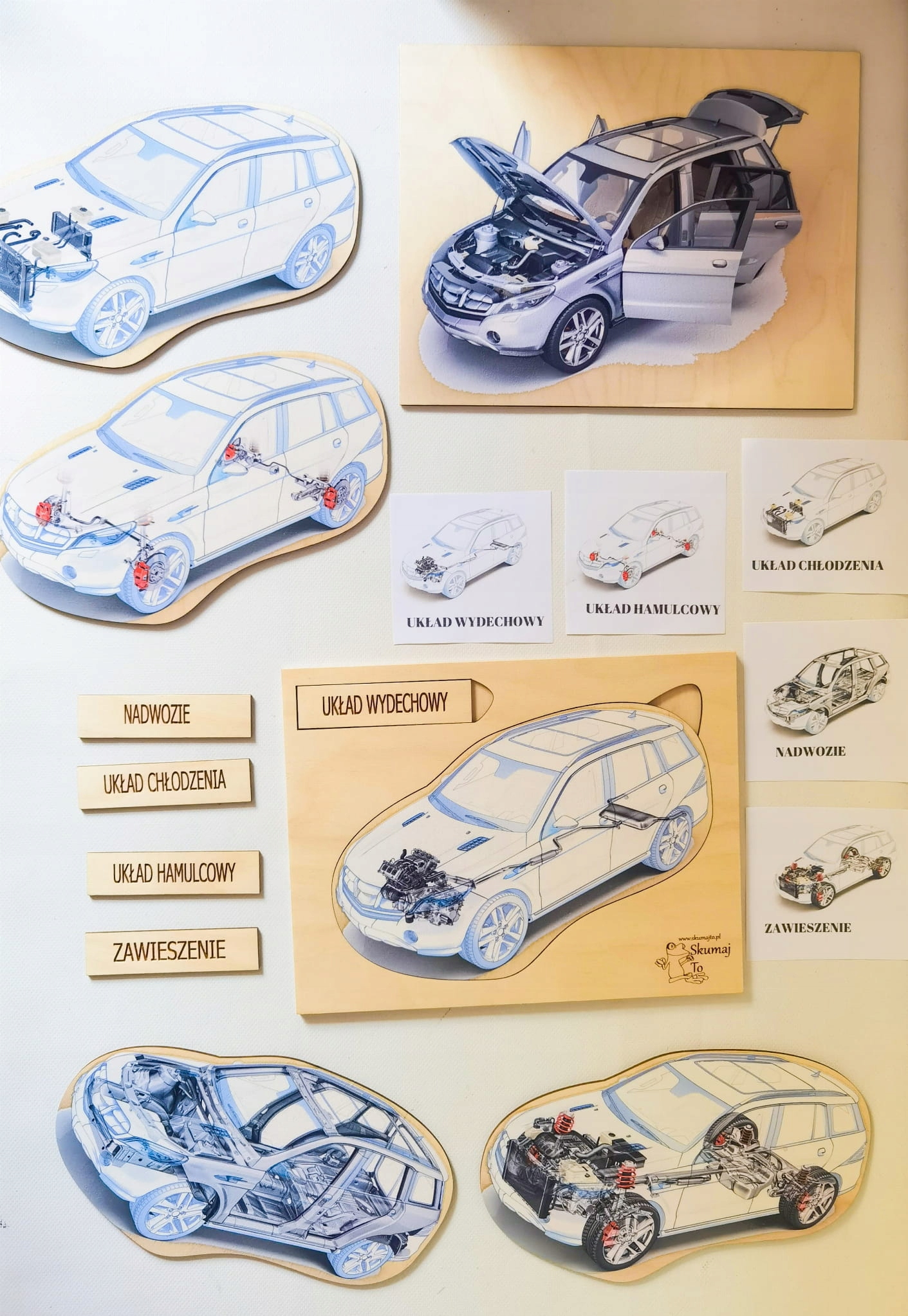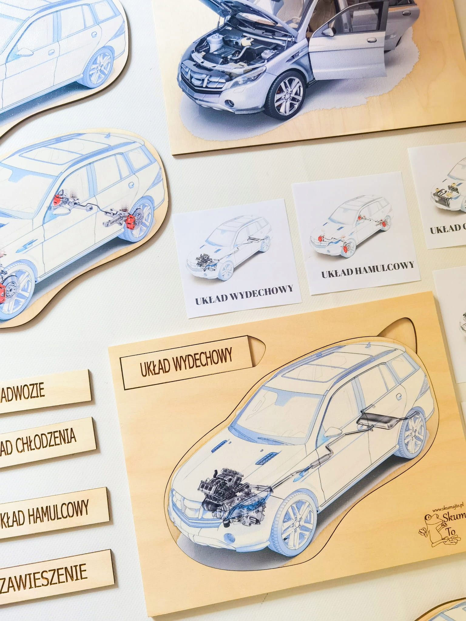 Эта головоломка содержит одно базовое размещение 20x30 см с заменяемыми элементами. Задача ребенка состоит в том, чтобы организовать соответствующий автомобиль и систему, которую он представляет. В наборе у нас также есть карты контроля ошибок, чтобы ребенок знал, правильно ли выполнять задачу.
