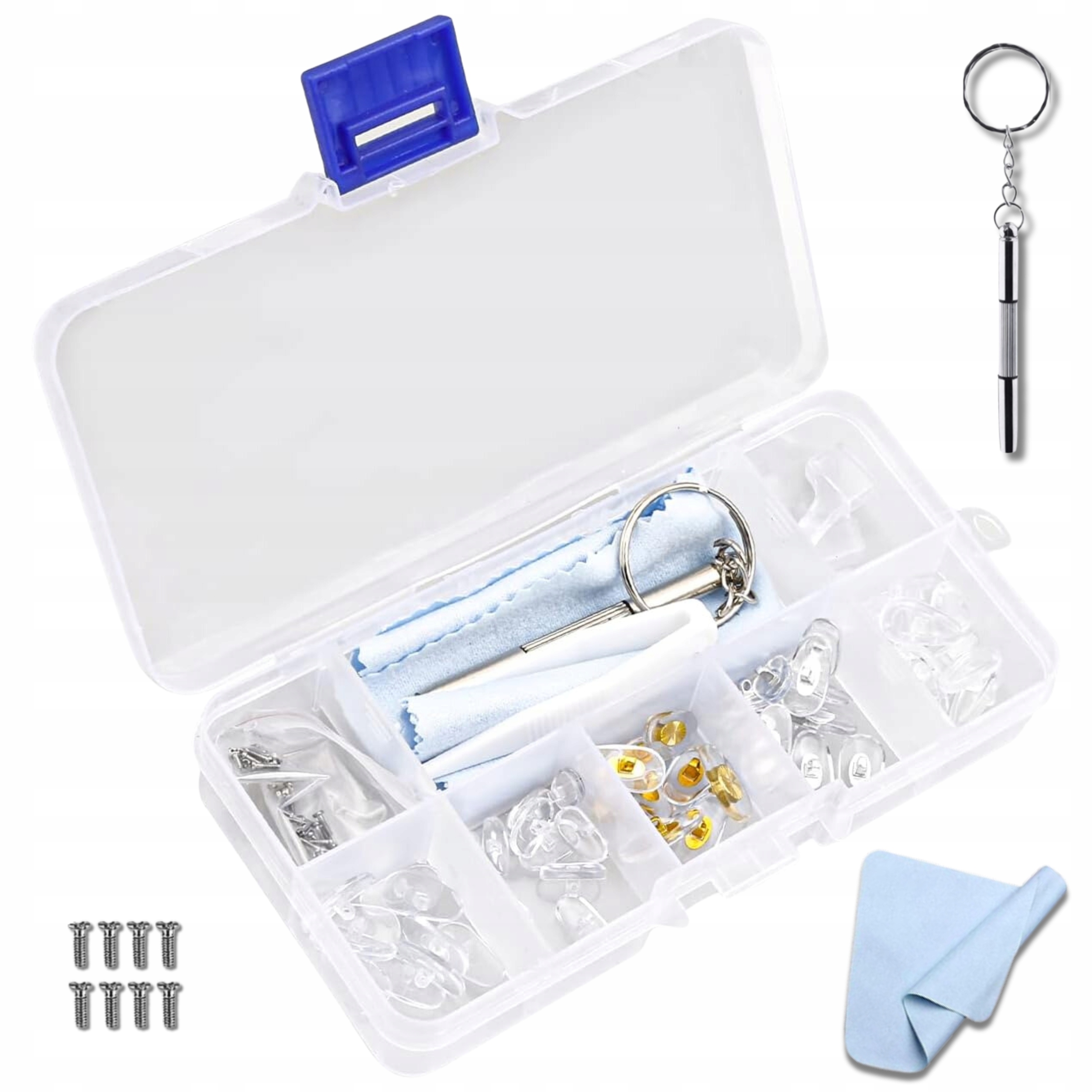 В комплект также входят отвертка, 60 штук винтов, подходящих для различных оправ, пинцет для точной сборки, салфетка для чистки стекол, которая обеспечит их кристальную чистоту, а также практичный отсек для хранения всех элементов.Это — незаменимый набор для всех, кто ценит надежность и хочет иметь под рукой необходимые инструменты для поддержания очков в идеальном состоянии.