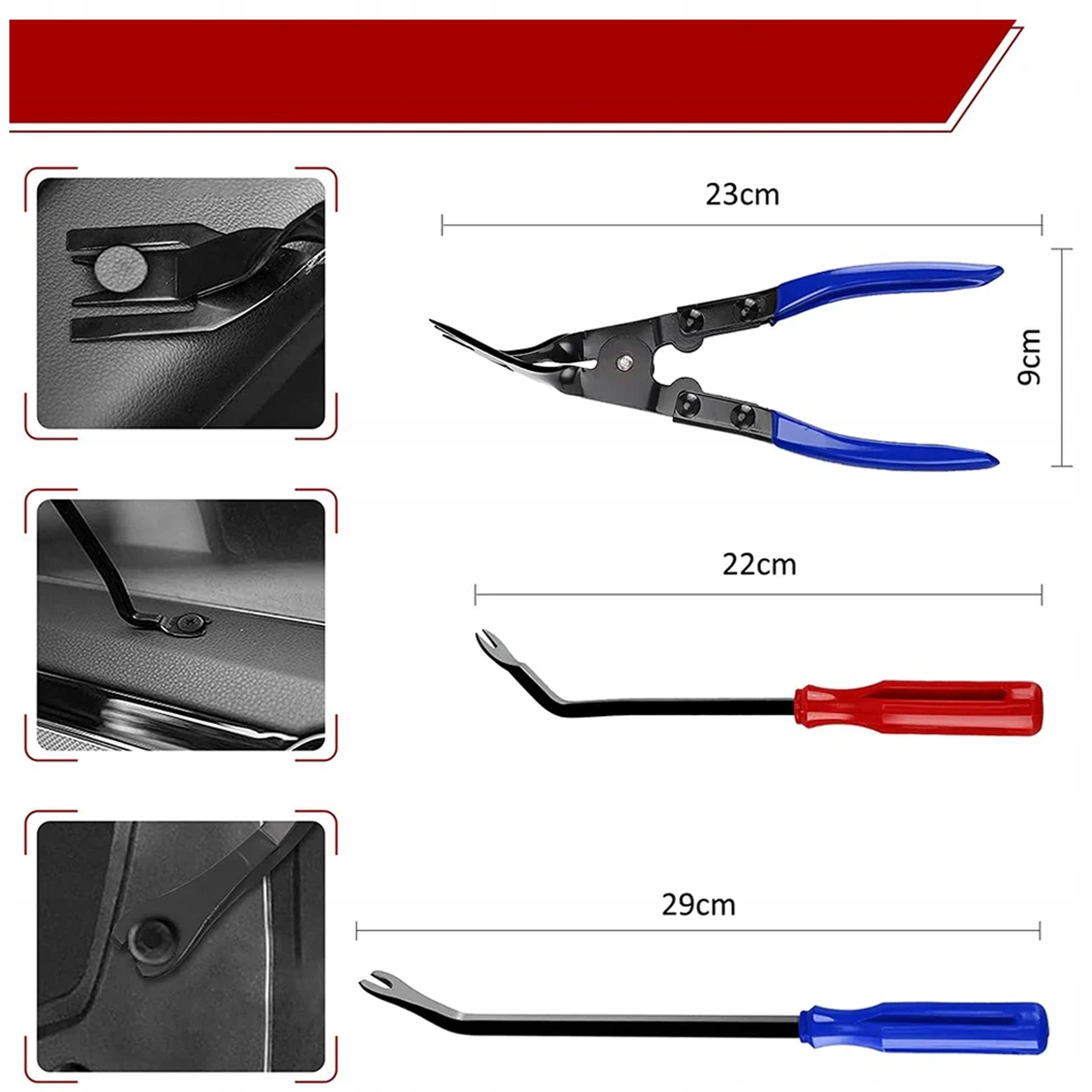 Набор состоит из элементов 39 , которые допускают быстрое и безрассудное демонтаж обивки внутри каждой машины. Специализированные инструменты, размещенные в удобном случае идеально подходят для демонтажа обивки и автомобильных полос. Этот набор особенно рекомендуется для использования на автомобиле, обивке, корпусе и краской. Это необходимые инструменты как для профессиональных семинаров, так и для людей, которые занимаются ремонтом