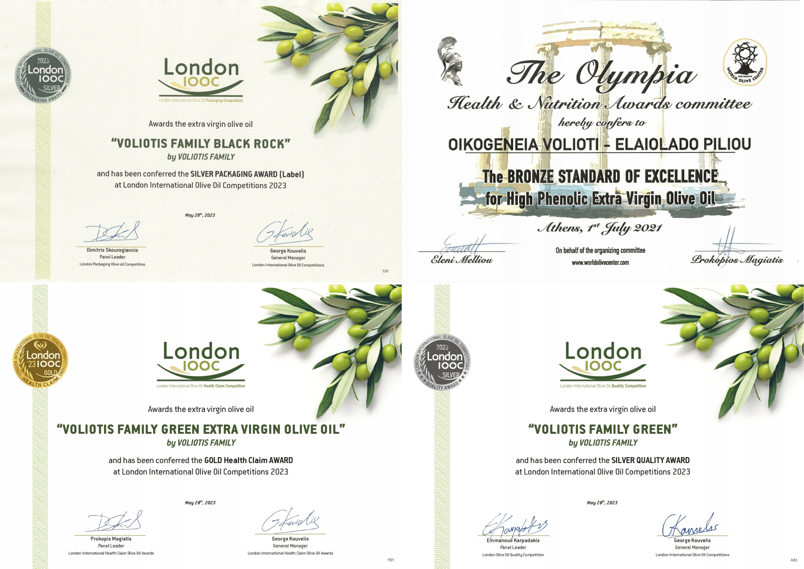 Обладатель серебряной награды Лондонского IOOC за «VOLIOTIS FAMILY BLACK ROCK» и «VOLIOTIS FAMILY GREEN EXTRA VIRGIN OLIVE OIL», а также серебряной награды от Olympia Health & Nutrition Awards за «ОЛИВКОВОЕ МАСЛО ПЕЛИОНА». . Золотые и бронзовые медали Лос-Анджелеса, а также награды Канады и Olive Trophies 2023 подтверждают его непревзойденное качество.
