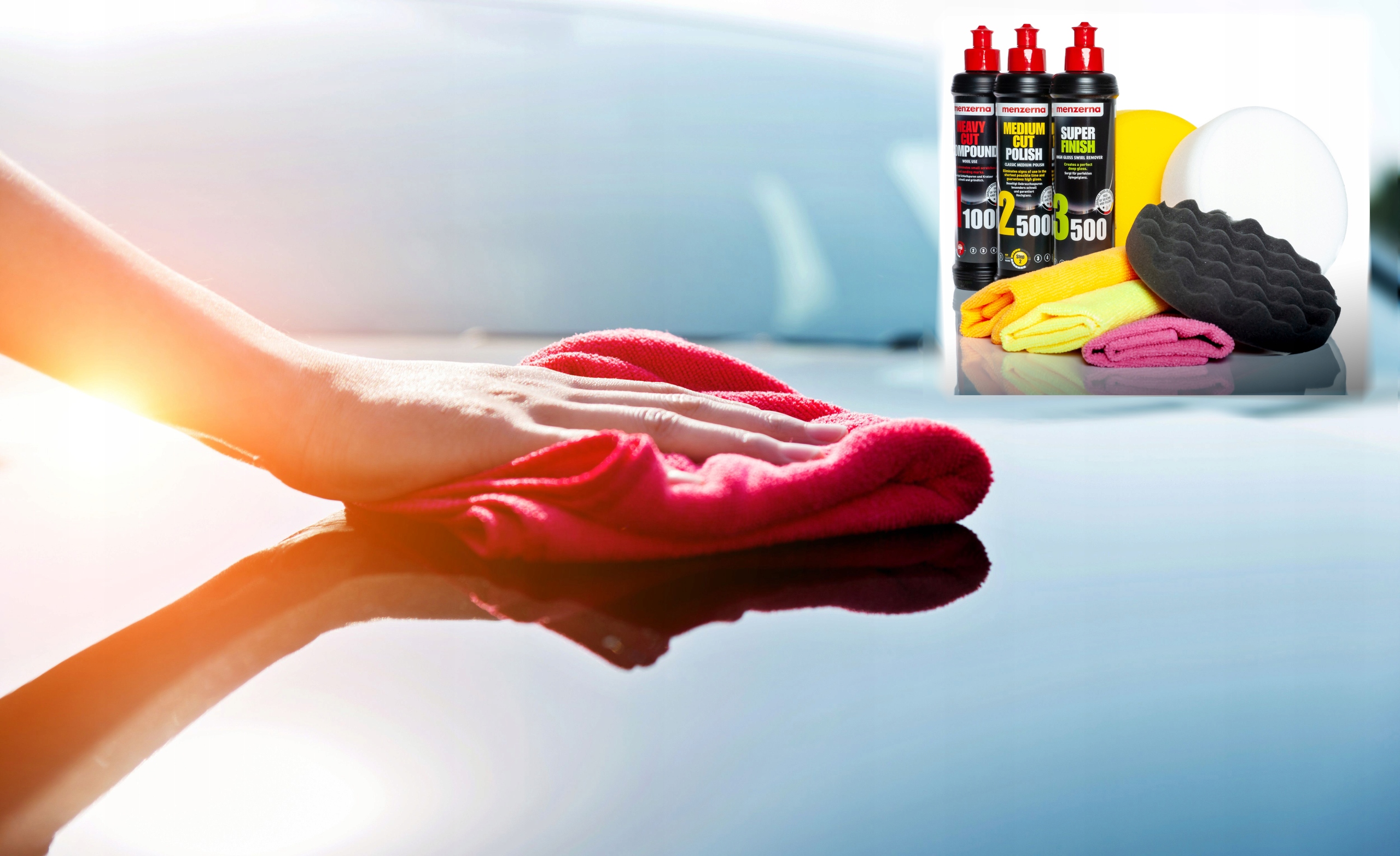 НАБОР MENZERNA + ПОЛИРОВАЛЬНЫЕ ДИСКИ — идеальный набор для проведения полной профессиональной коррекции лакокрасочного покрытия в три простых этапа — устранение царапин, восстановление блеска, усиление глубины цвета и доведение его до идеального состояния. зеркальный блеск.