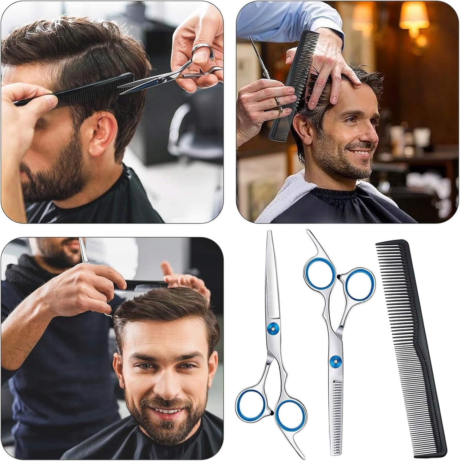 Универсальный набор для стрижки волос включает в себя все необходимые аксессуары для профессиональной укладки. В комплект входят ножницы для стрижки и филировки, расчески, зажимы и парикмахерская накидка. Идеально подходит для домашнего и профессионального использования, обеспечивает легкую и точную резку.