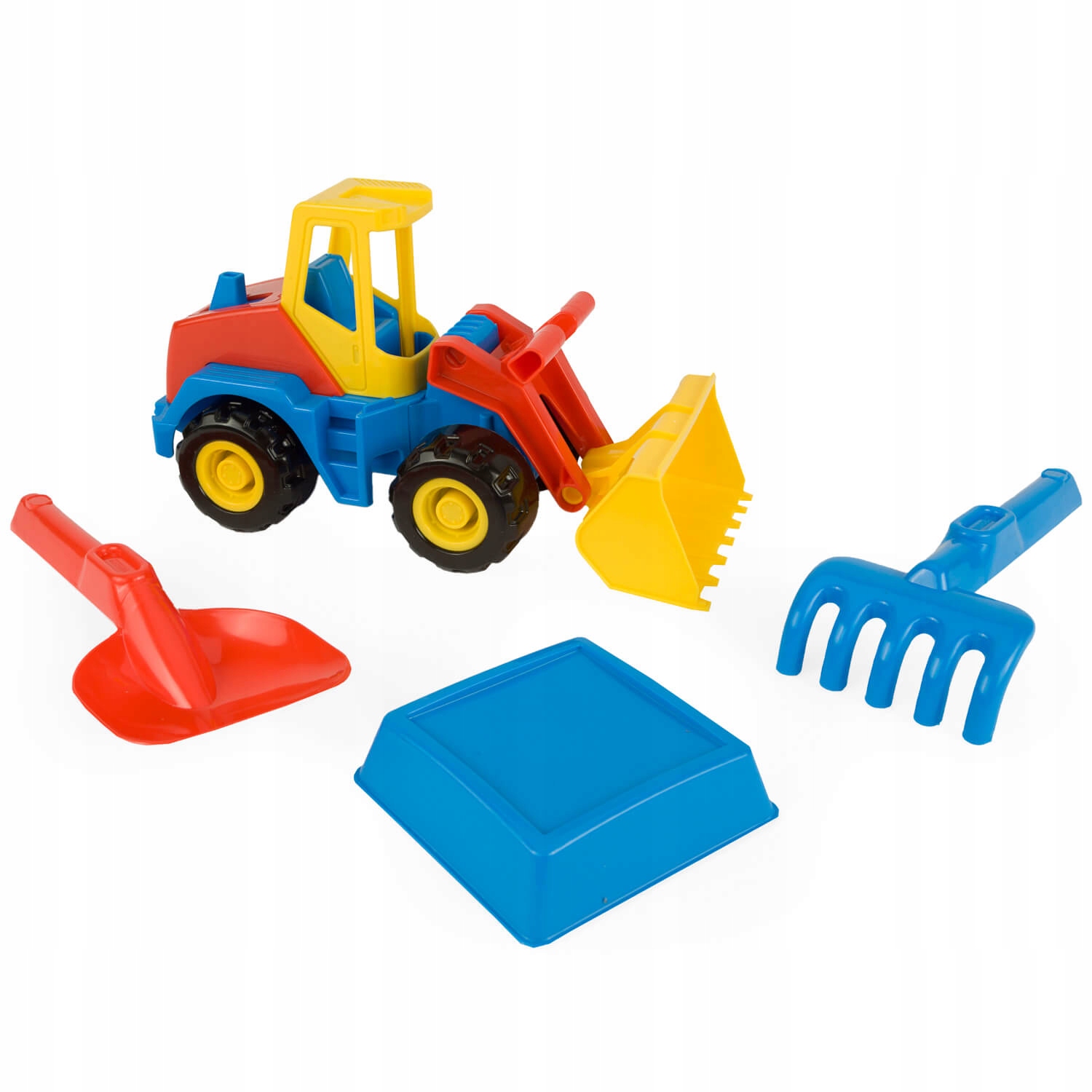 Вот набор который удовлетворит каждого любителя пляжного отдыха: погрузчик с лопатой, граблями и формочкой.