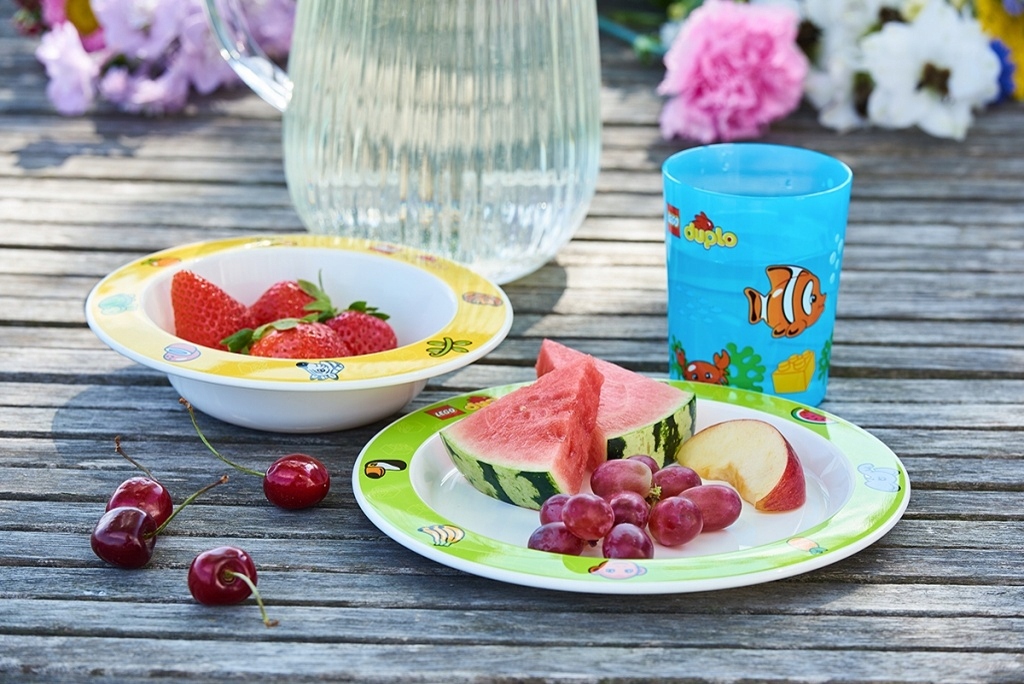 Поставьте на стол забавный набор посуды LEGO® DUPLO® (853920) и каждый ужин станет для вашего малыша радостным приключением. В комплект входит кружка, большая плоская тарелка и глубокая тарелка поменьше. Эта прочная посуда для малышей изготовлена из полипропилена и украшена изображениями еды и самых популярных животных LEGO® DUPLO®.