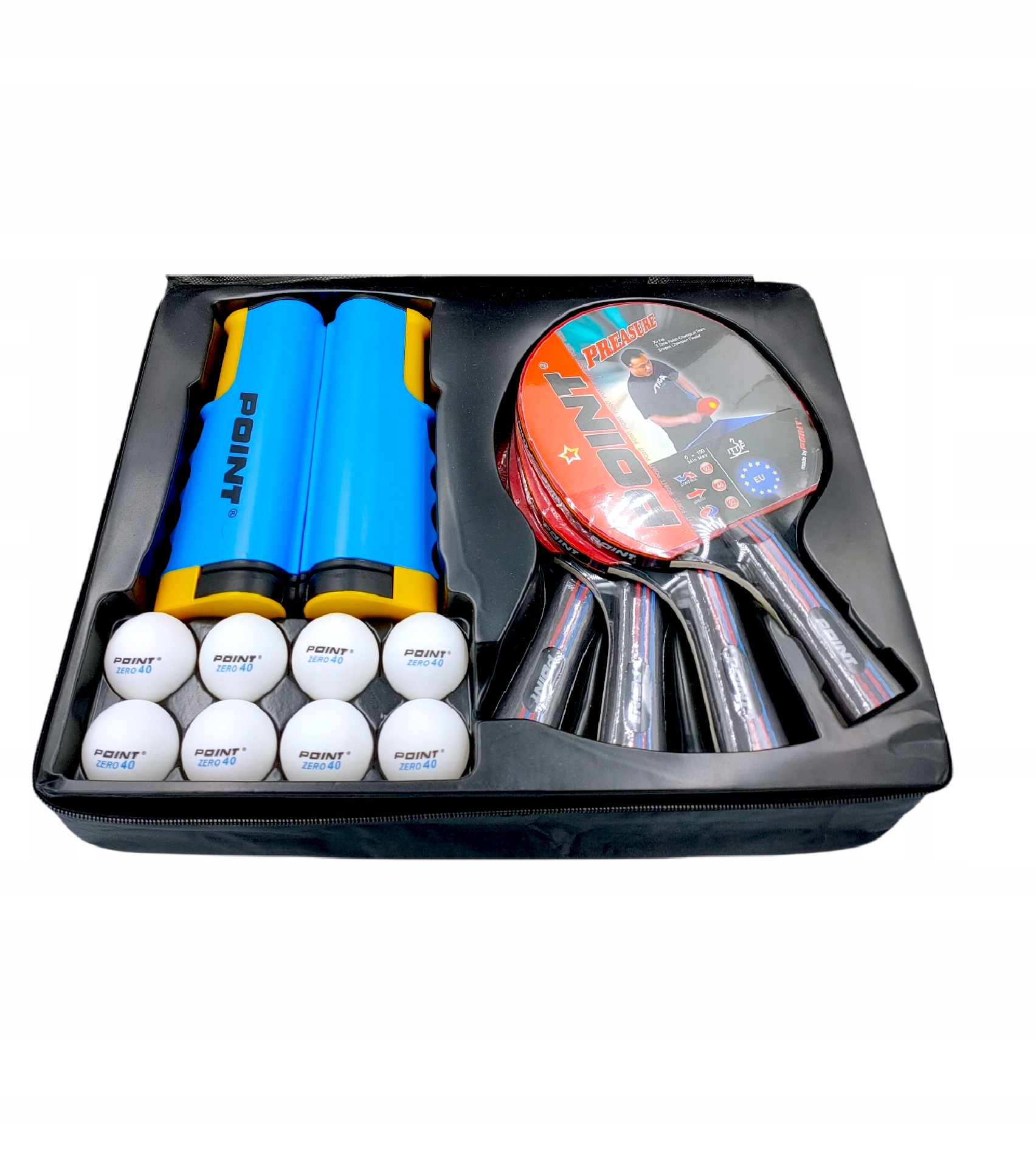 В комплект входят 4 однозвездочковые ракетки с высоким контролем, 8 мячей и универсальная сетка, которую можно прикрепить. в таблицу любого типа.