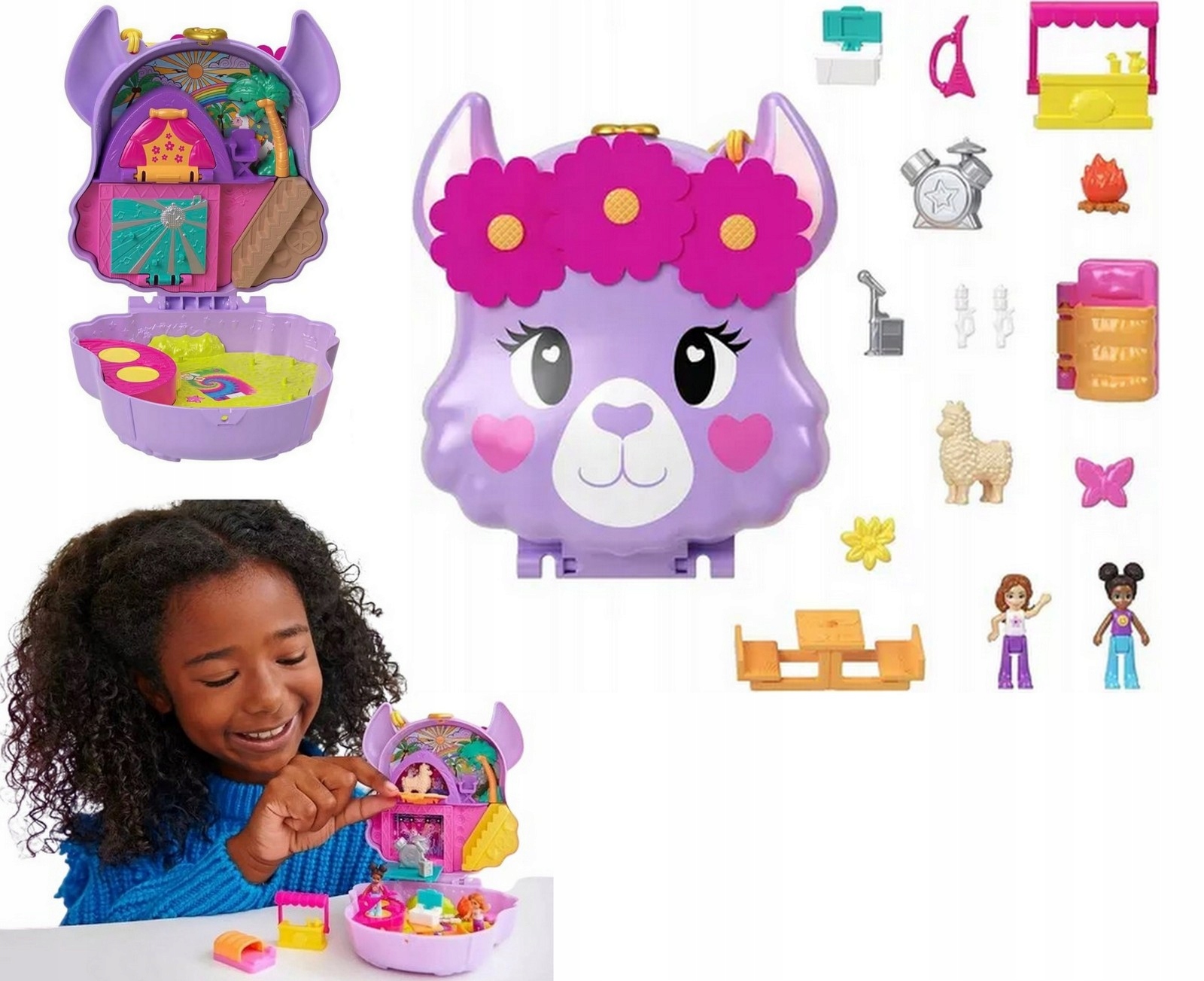 - Компактный набор Polly Pocket Camping Llama имеет форму очаровательной мордочки ламы с цветочной короной (украшен приятной на ощупь материалом).
